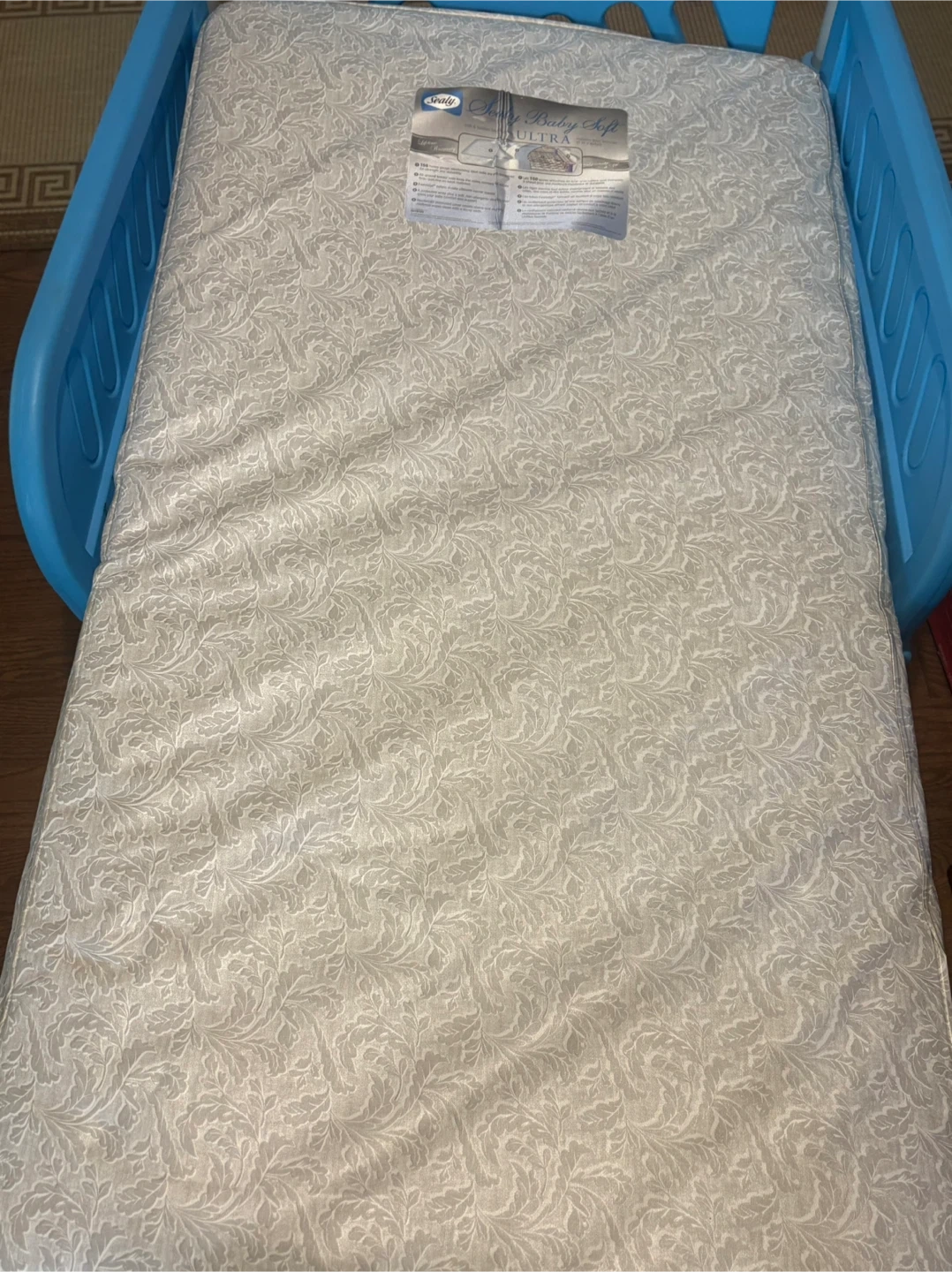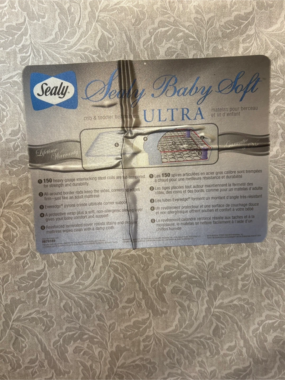 Sat in storage without use. Excellent condition!!! Selling a Sealy Baby Soft Ultra crib and toddler mattress. It's designed with 150 heavy gauge interlocking steel coils that are self-tempered for strength and durability. The all-around border rods keep the sides, corners, and edges firm, ensuring a safe and comfortable sleep for your little one. The reinforced laminated cover resists stains and moisture, making mattress clean up easy with a damp cloth. Cash only Pick up Richmond Hill