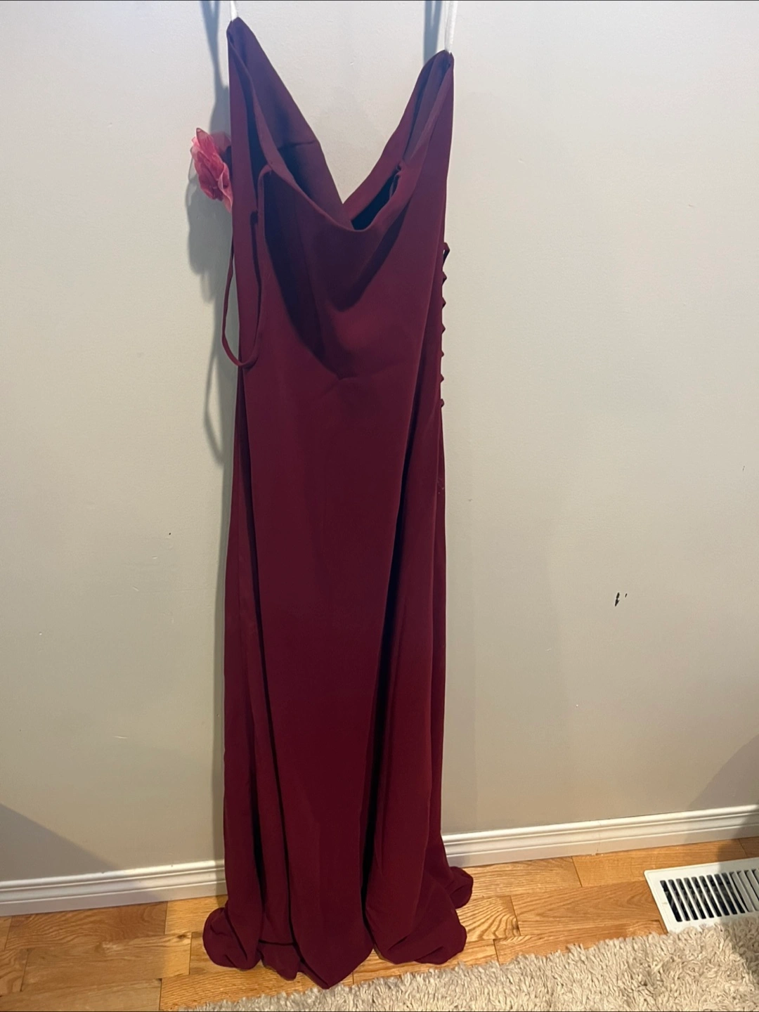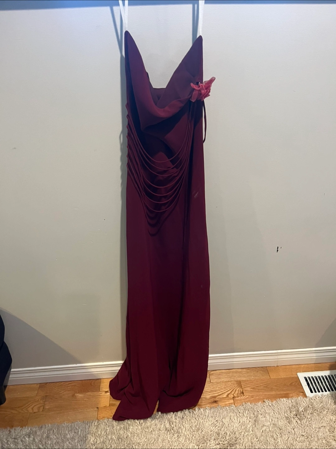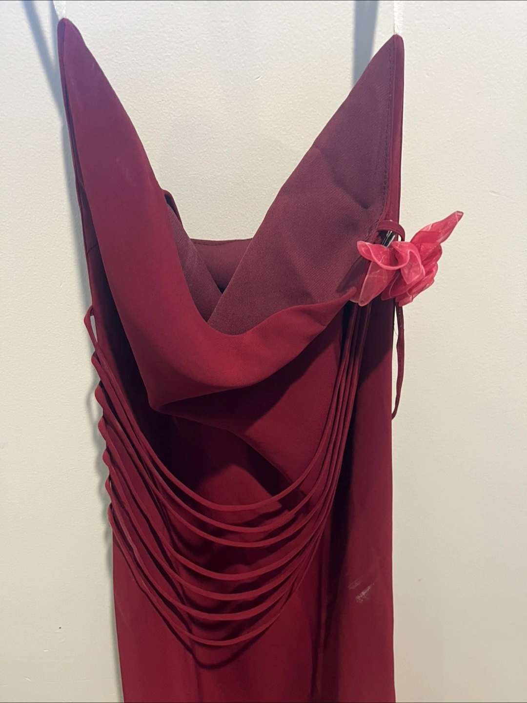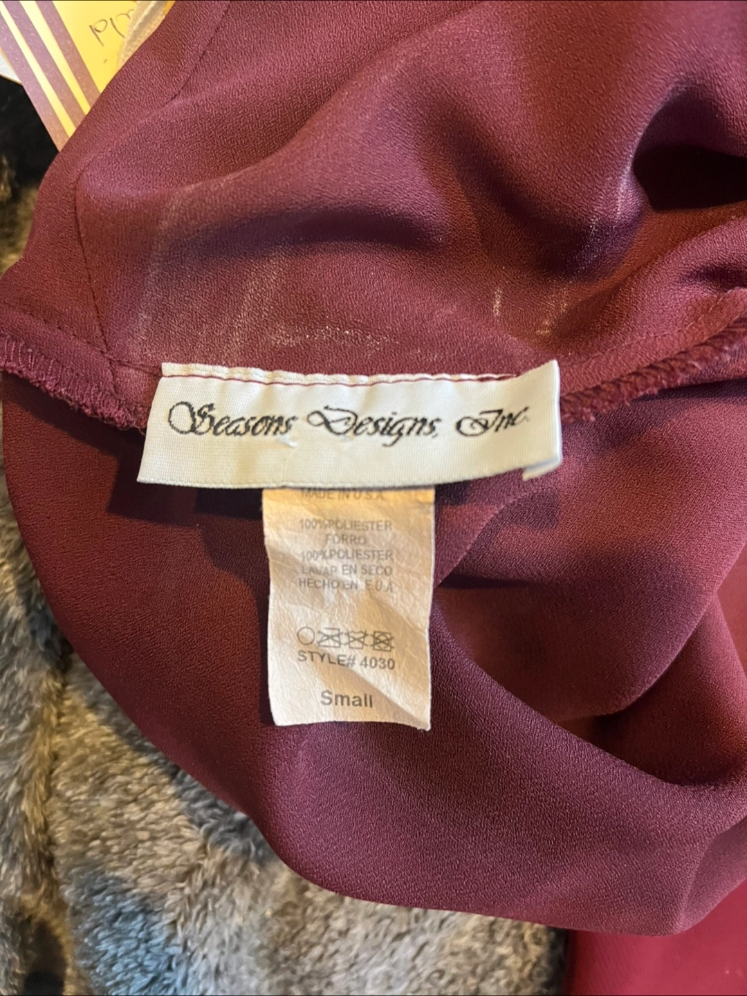 This is a beautiful dress from Seasons Designs Inc. in a size small. It's made of 100% polyester and has a lovely design. Perfect for a special occasion!