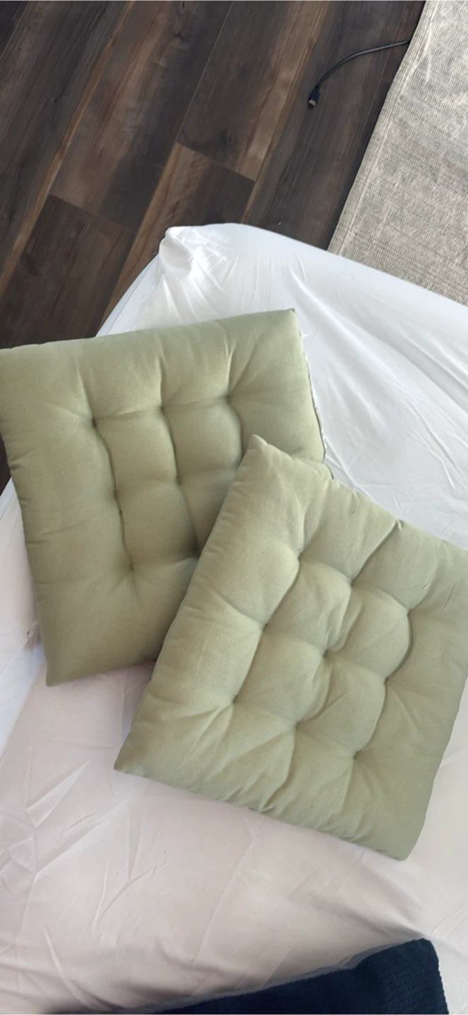 Selling a set of two seat cushions. They are a light green colour and in good condition. Perfect for adding to your chairs or for seating on the floor