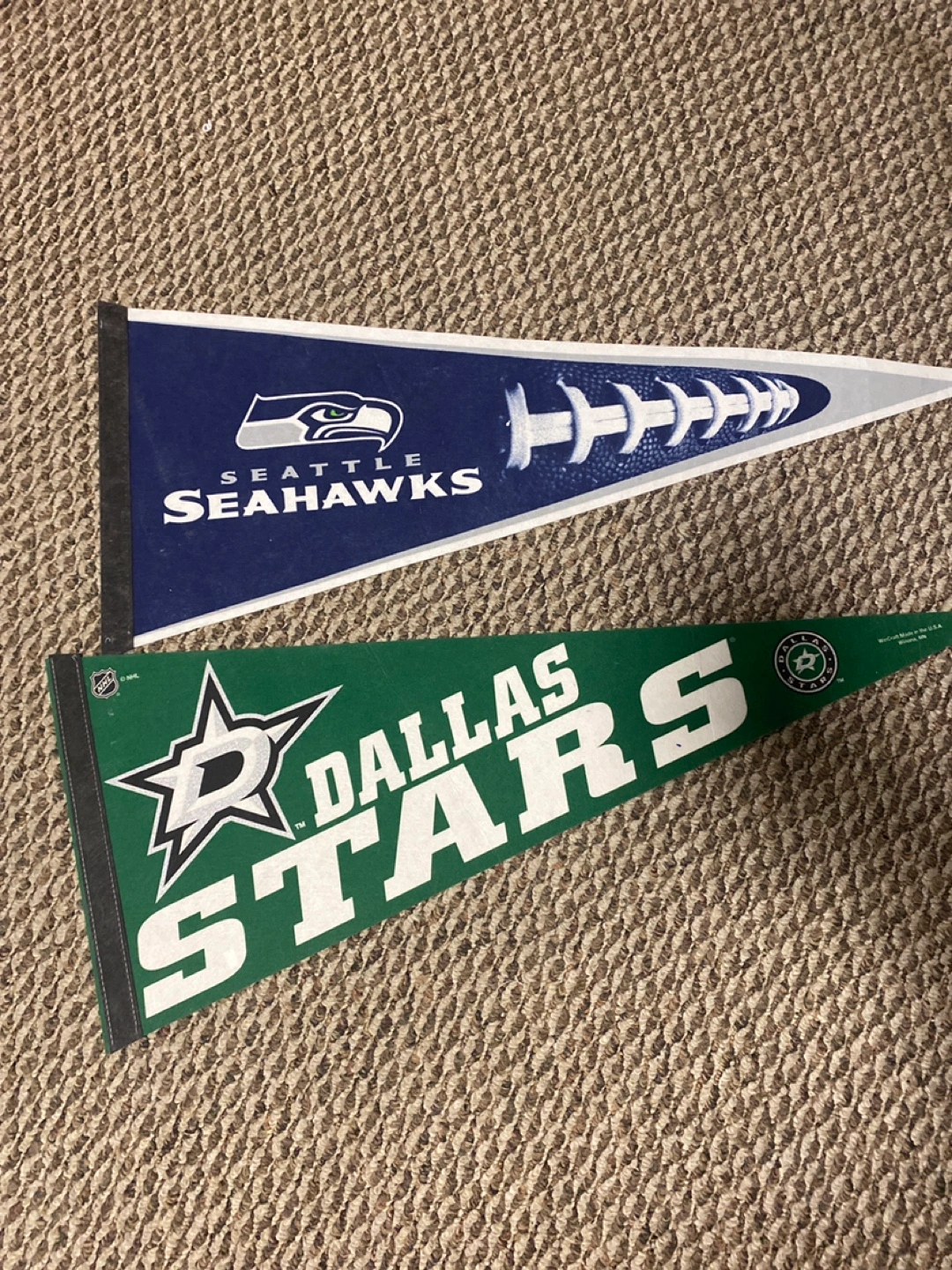 Selling two sports pennants! One is for the Seattle Seahawks, and the other is for the Dallas Stars. Perfect for decorating your game room or showing off your team spirit Willing to negotiate on the price! You can just buy one if you want.