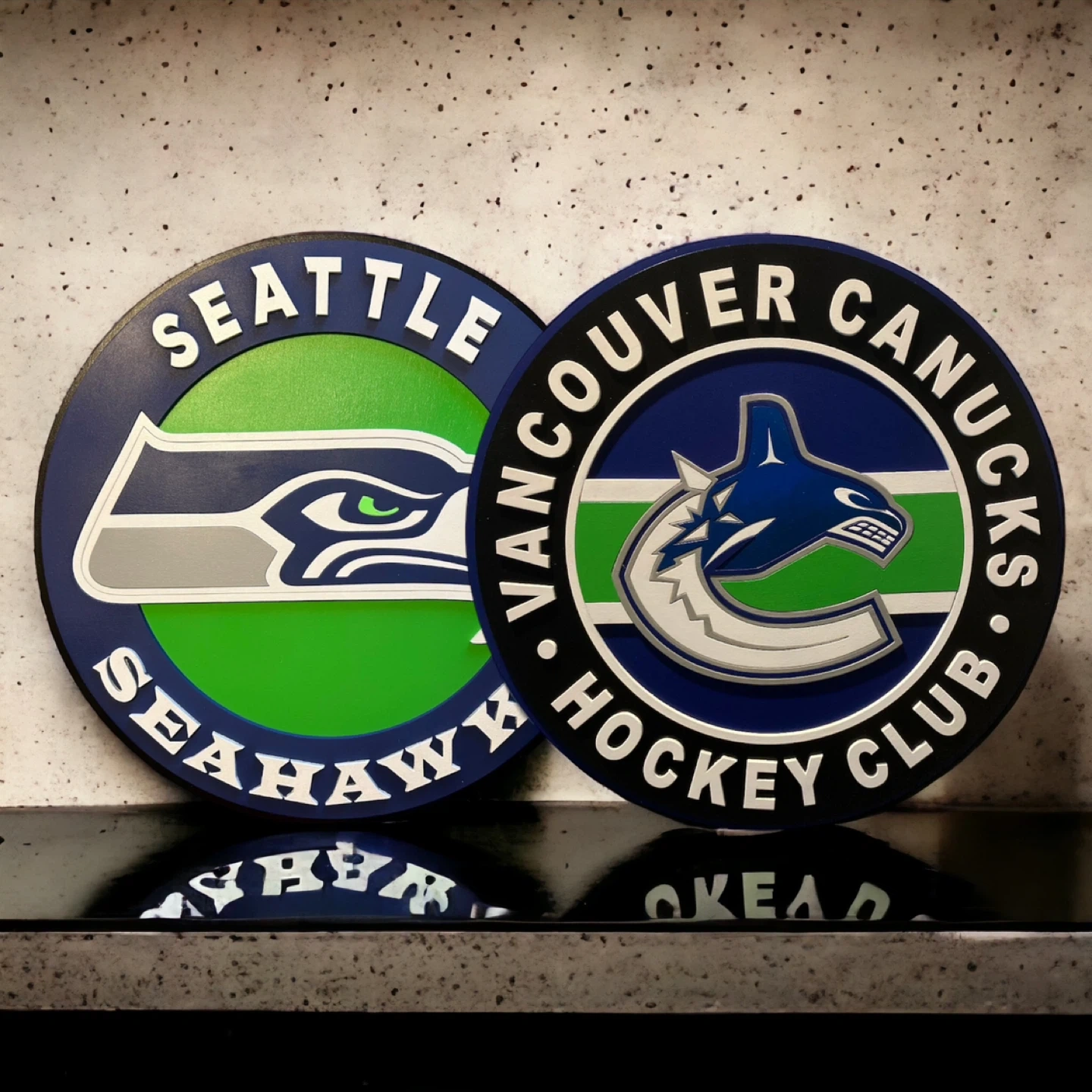 Selling a set of two signs featuring the Seattle Seahawks and Vancouver Canucks Hockey Club logos. These are great for any sports fan's collection! Wall mounted. 15 inches in diameter. $125 each or set of two for $200.