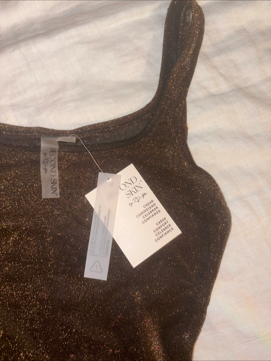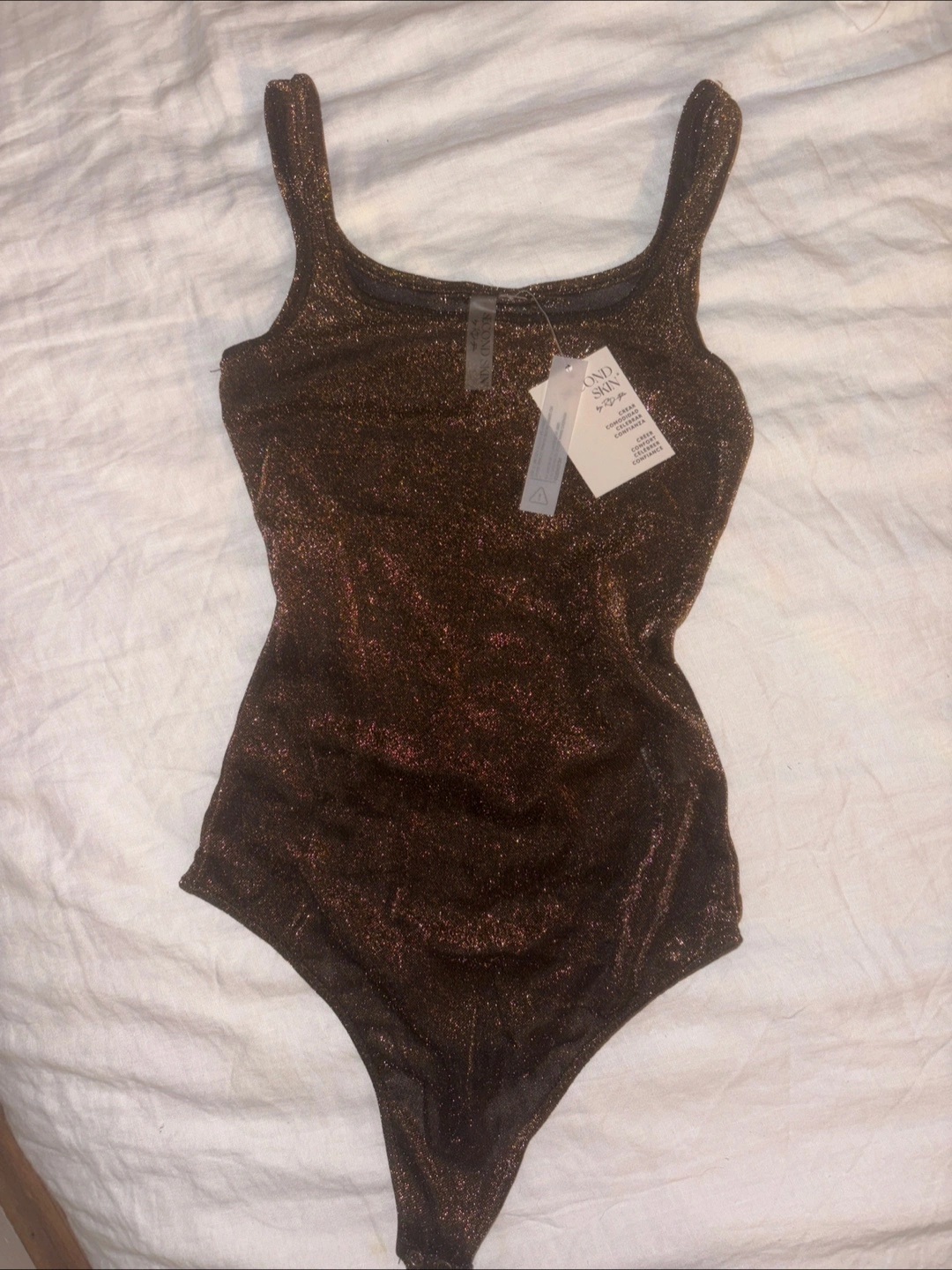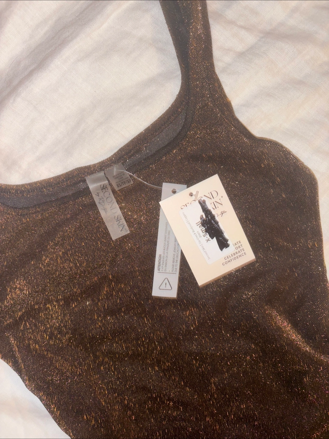 Selling a brand new Second Skin bodysuit! It still has the tags on it. Size: XS Brand: Second Skin Color: Brown/Gold