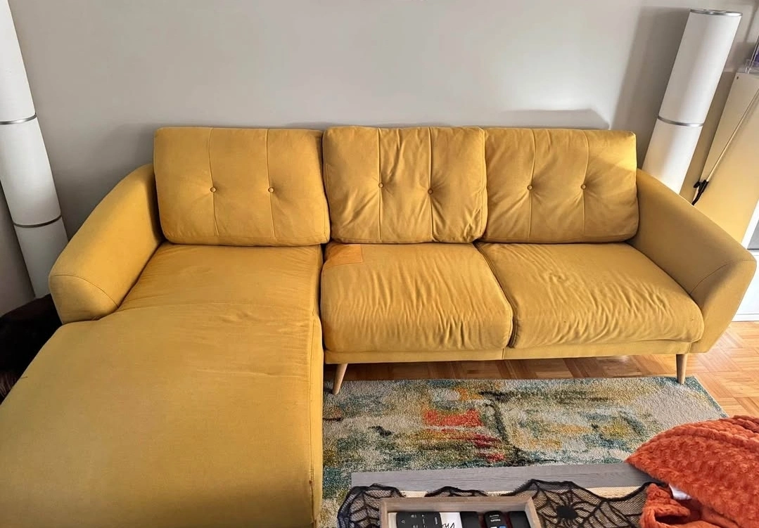 Selling a comfy yellow tufted sofa! It's a great piece for adding a pop of colour to your living room. There is some wear and tear, as shown in the photos, but it's still got lots of life left