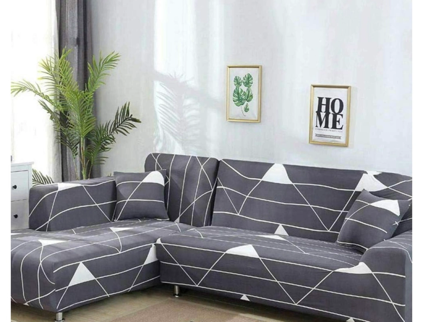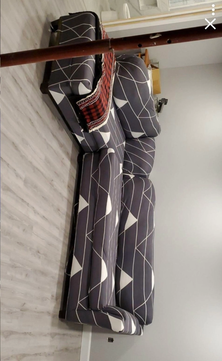 Geometric-patterned sofa cover for a sectional sofa in grey and white. In good condition, just one small hole. Originally $95.58 plus tax on Amazon, now selling for only $25!