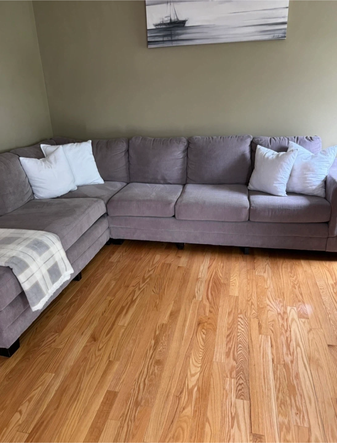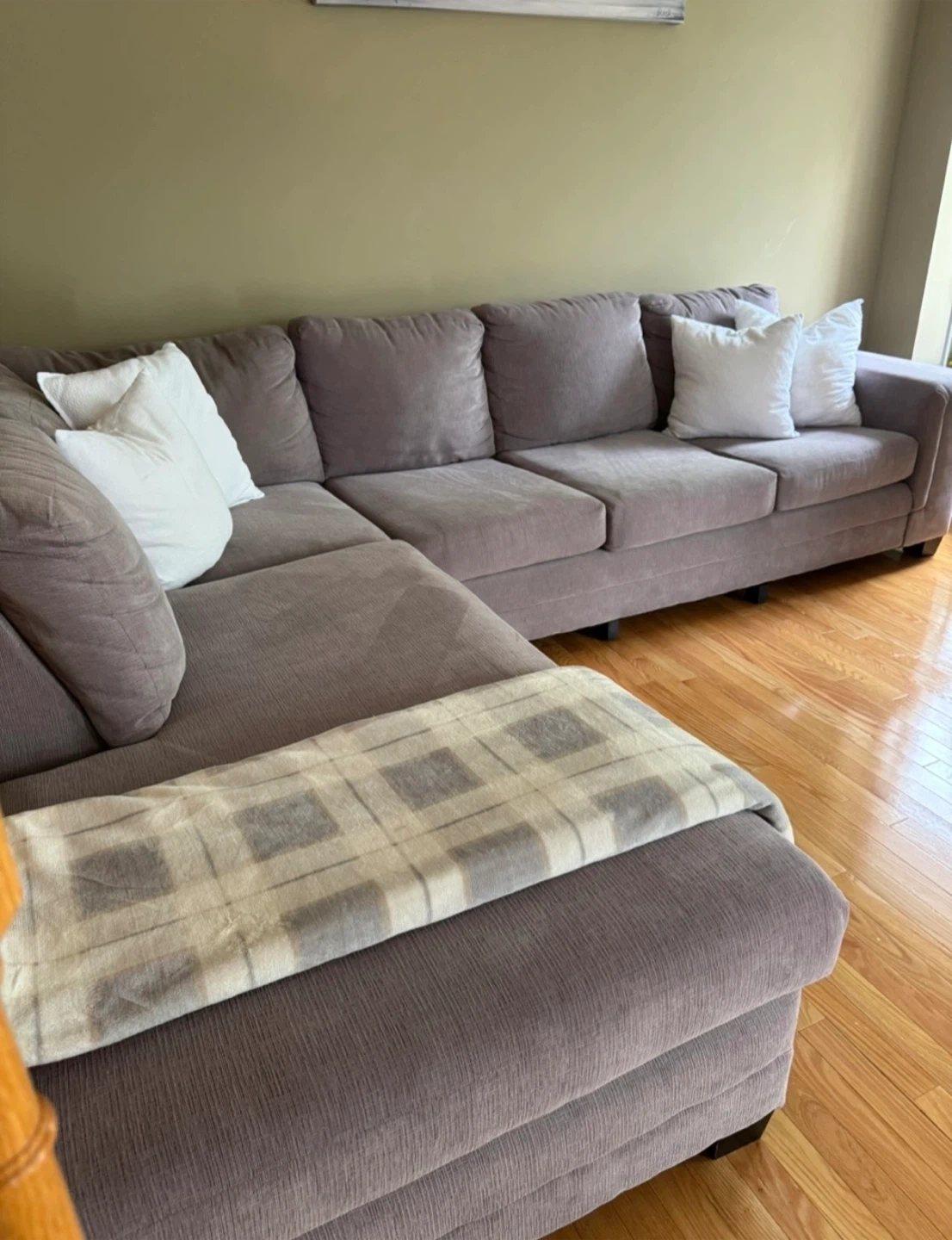 Selling a comfortable sectional sofa in great condition. It's a perfect addition to any living room. The colour is a beautiful neutral tone that will match any decor. It's a great size for lounging and entertaining. Ready for a new home!