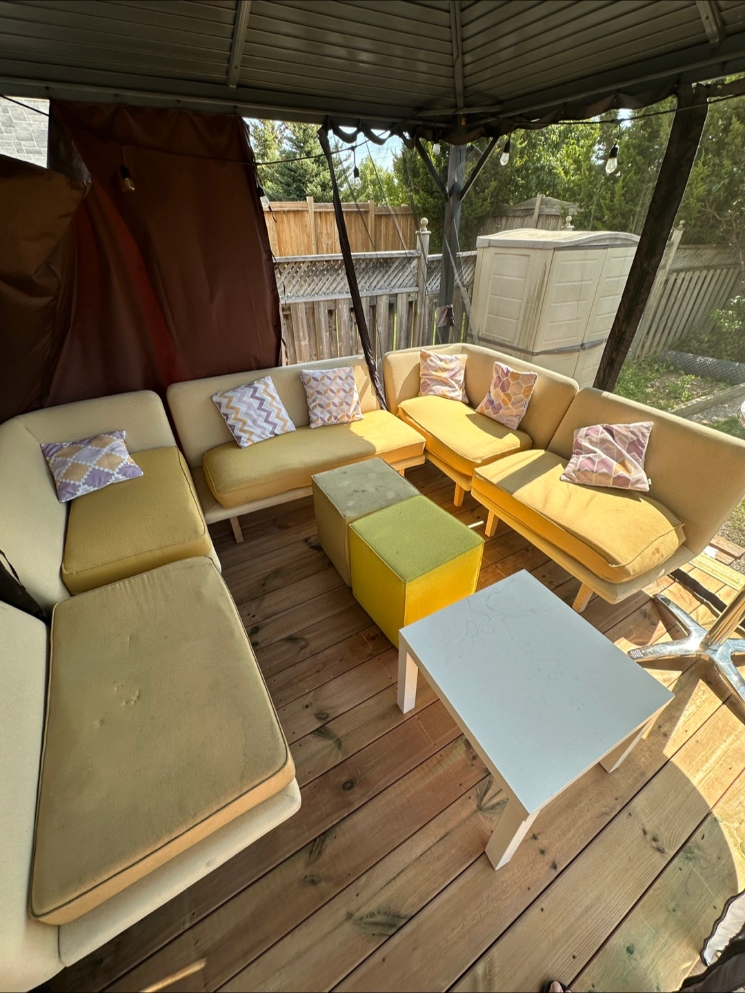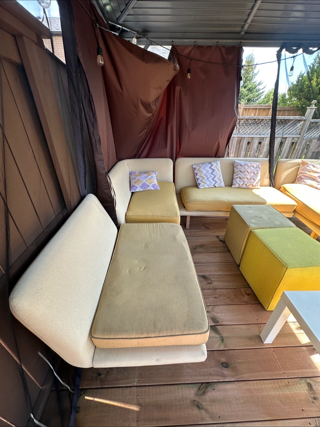 Selling a comfortable outdoor sectional sofa set. It's perfect for lounging and enjoying the outdoors. The set is in good condition and features a sunny yellow colour. It includes several sections that can be arranged to fit your space. Great for creating a cozy outdoor or indoor living area!