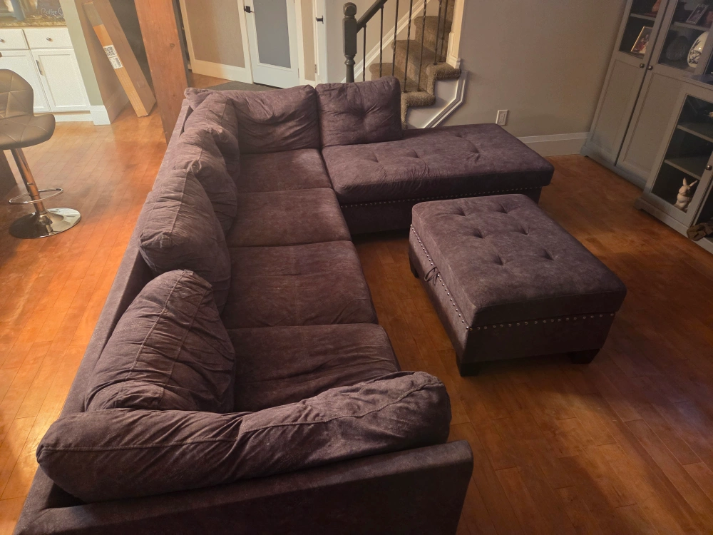 Selling a comfy sectional sofa with a matching ottoman! It's a great piece for a living room or entertainment area. The colour is a nice brownish-purple, and it's in good condition. Perfect for lounging and relaxing after a long day