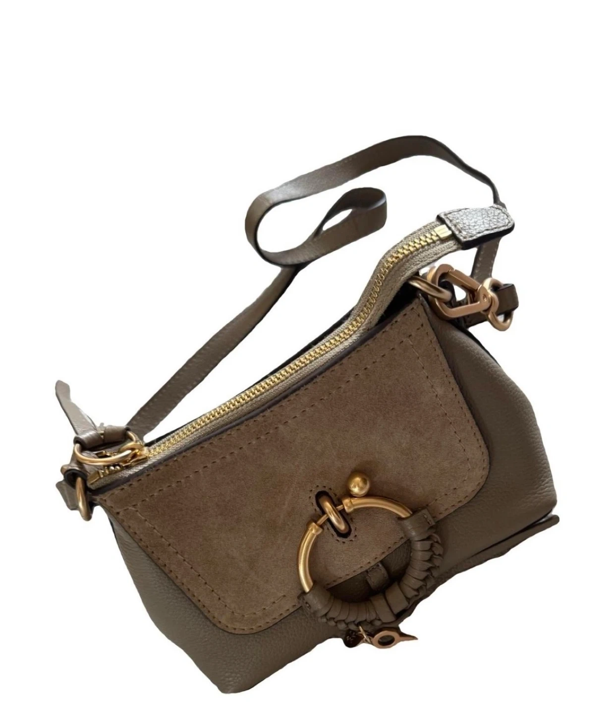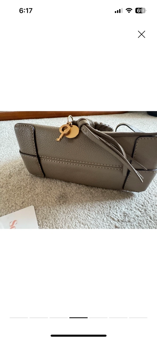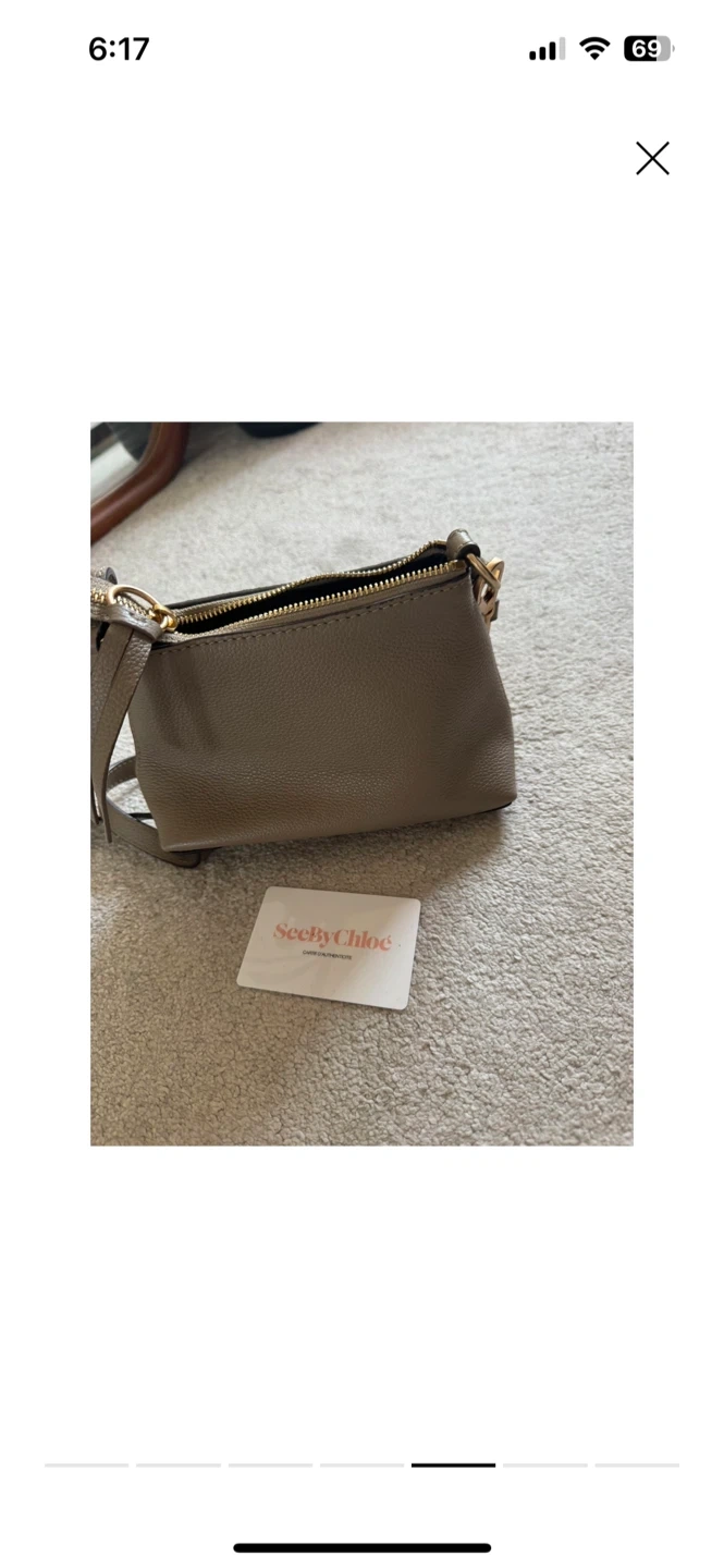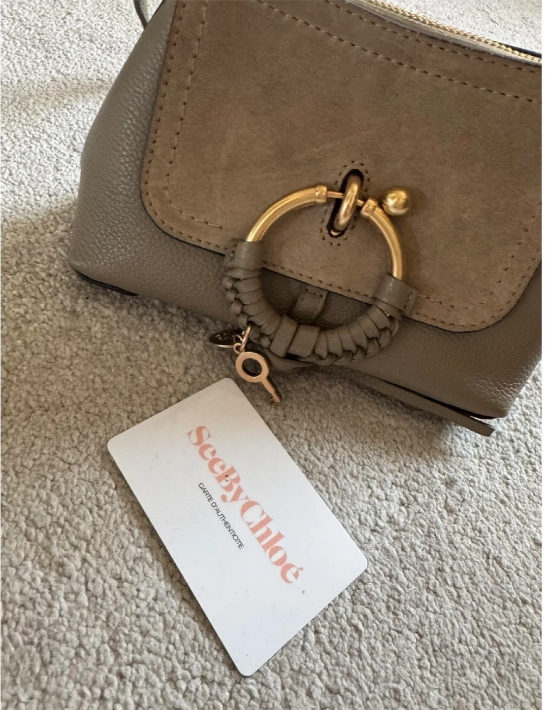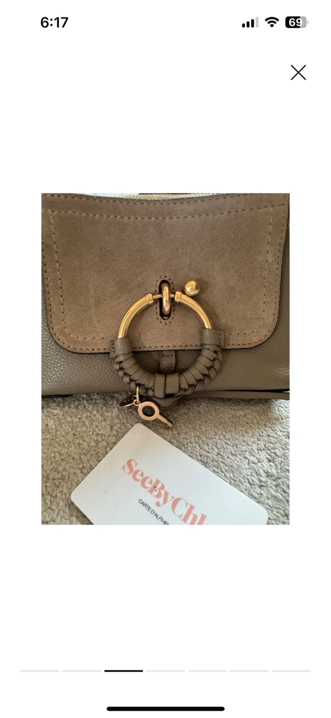 Here's a cute See By Chloé Mini Joan crossbody bag! It's in great condition and perfect for carrying your essentials. The bag features a stylish design with a distinctive ring detail and a key charm. It's a versatile accessory that can be dressed up or down!