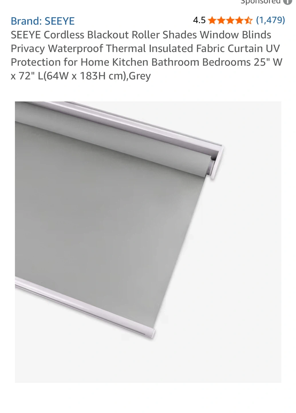Selling a BRAND NEW SEEYE cordless blackout roller shade in grey. It's 25 inches wide and 72 inches long, perfect for a bedroom, kitchen, or bathroom. This shade is waterproof, thermal insulated, and provides UV protection. Comes with the original box and all included accessories!