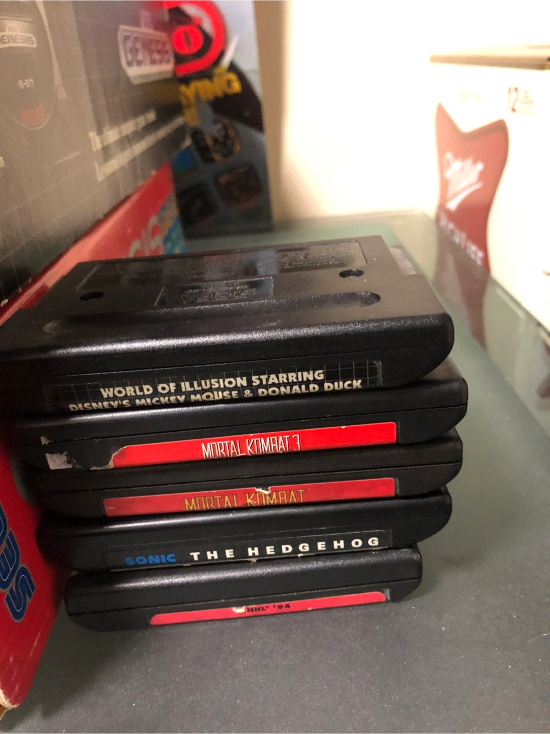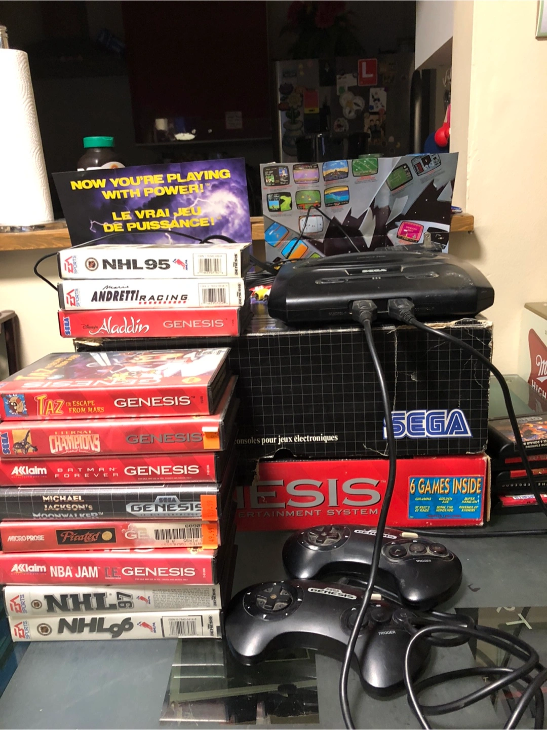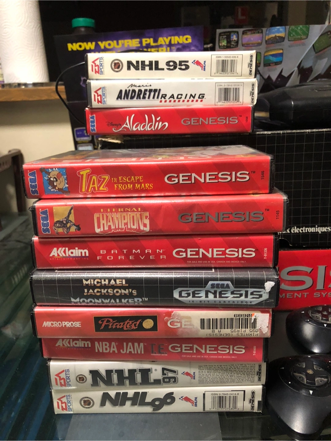 SEGA DOES what NintenDONT! Games: Aladdin (in box) $30 Batman Forever (in box w manual) $10 Columns $2 Comix Zone $20 Eternal Champions (in box) $10 Eternal Champions (loose) $5 Home Alone $5 Justice League $10 Mario Andretti Racing (in box) $5 Michael jacksons moonwalker (in box w manual) $150 Mortal Kombat $10 Mortal Kombat 3 $10 Nba Jam in box $20 Nhl 94 $10 Nhl 95 in box $10 Nhl 96 in box $10 Nhl 97 in box $10 Shining Force $30 Sid Meiers Pirates Gold (in box w manual) $50 Streets of rage $20 Sonic the hedgehog $10 Sonic the Hedgehog 2 $10 Taz in Escape From Mars (in box) $10 Consoles : SEGA 1st gen in box $140 SEGA 2nd gen in box $180 Loose SEGA 2nd gen 1 controllers $40 each