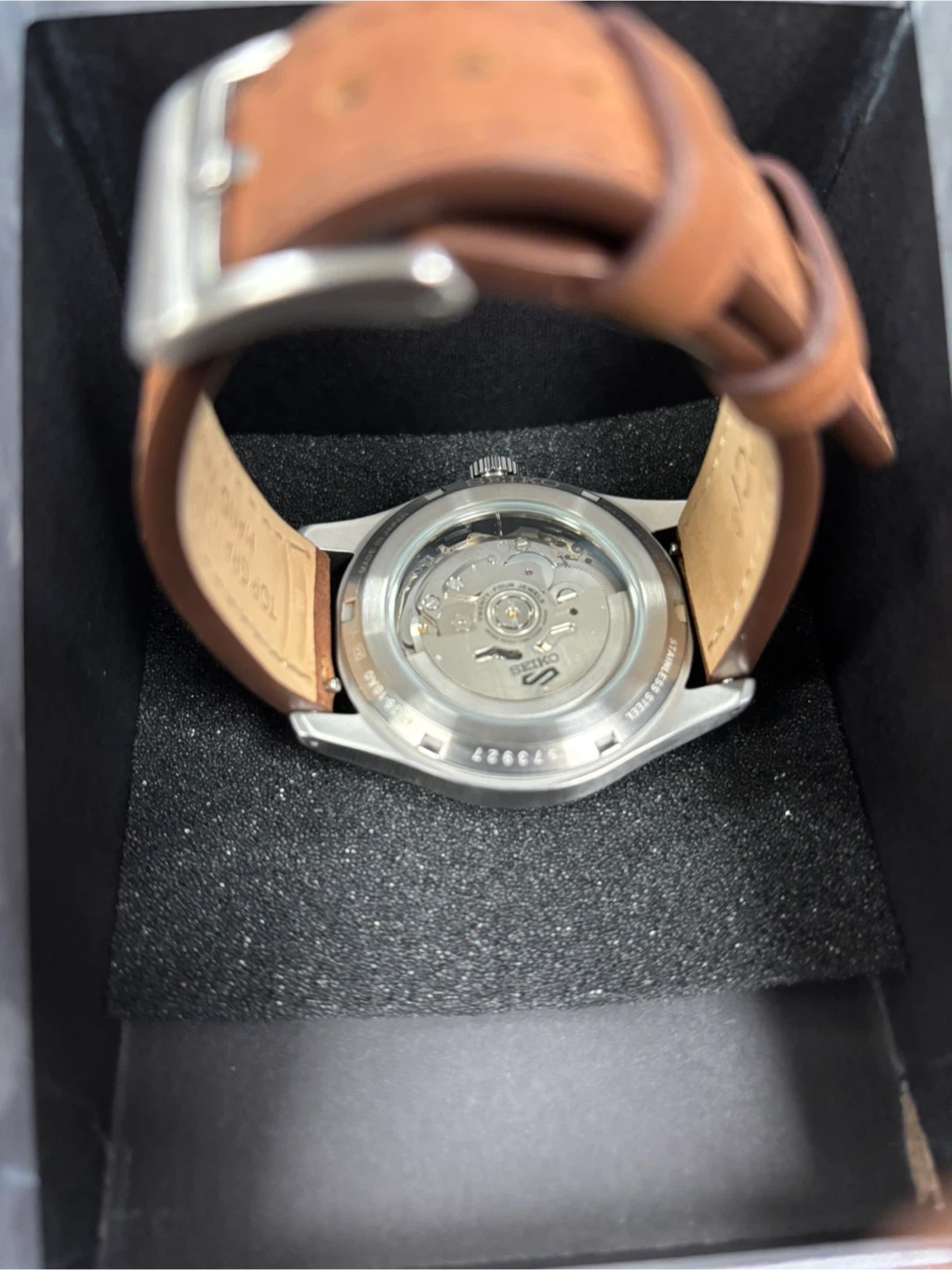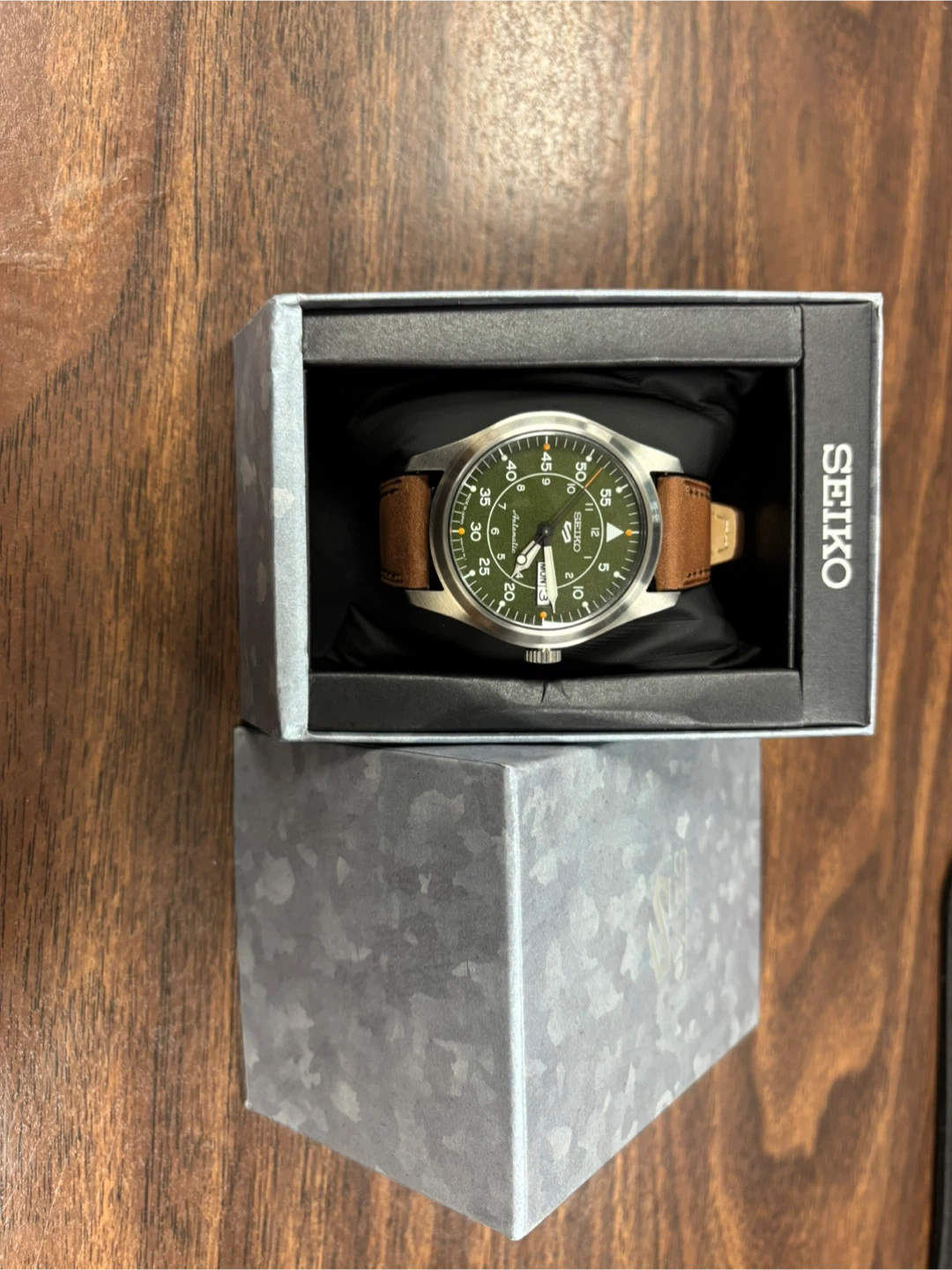 Selling a Seiko 5 automatic watch. It's in great Brand New condition and comes with its original box. The watch features a field-style design with a striking green dial and a comfortable brown leather strap. Japan Import.