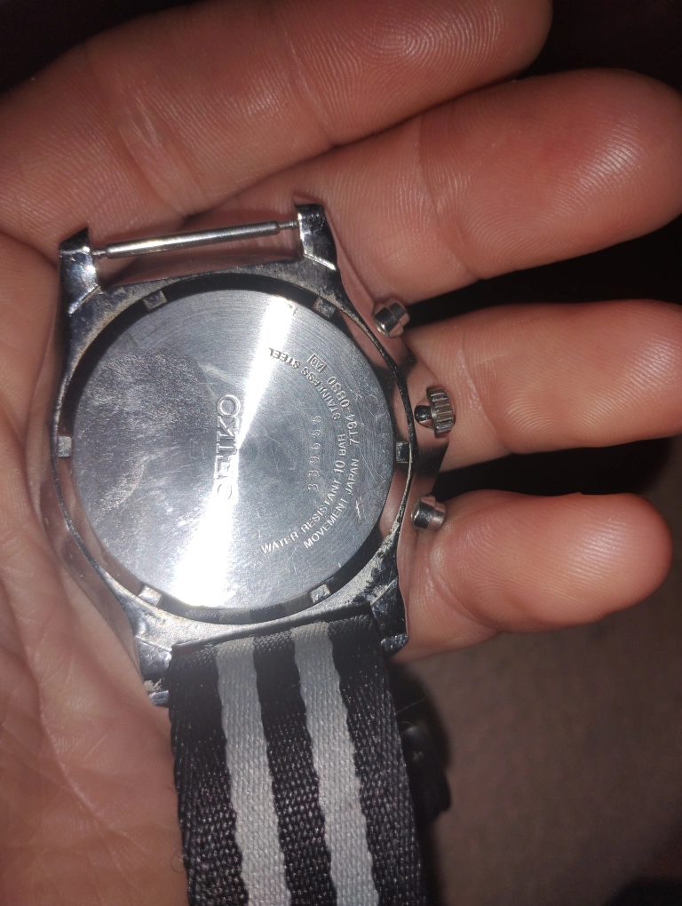 Selling a Seiko chronograph watch with a black and white striped band. It's in good condition and ready for a new owner! The watch features a chronograph function and is water resistant to 100m. The movement is made in Japan.