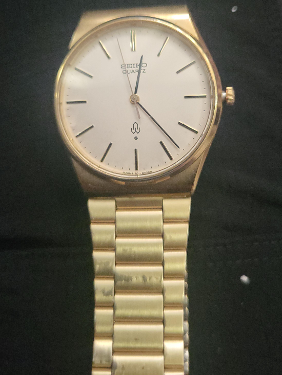 Selling a Seiko Quartz watch with a gold-tone finish. The band is stainless steel and marked 'Bambi'. It's a stylish timepiece!
