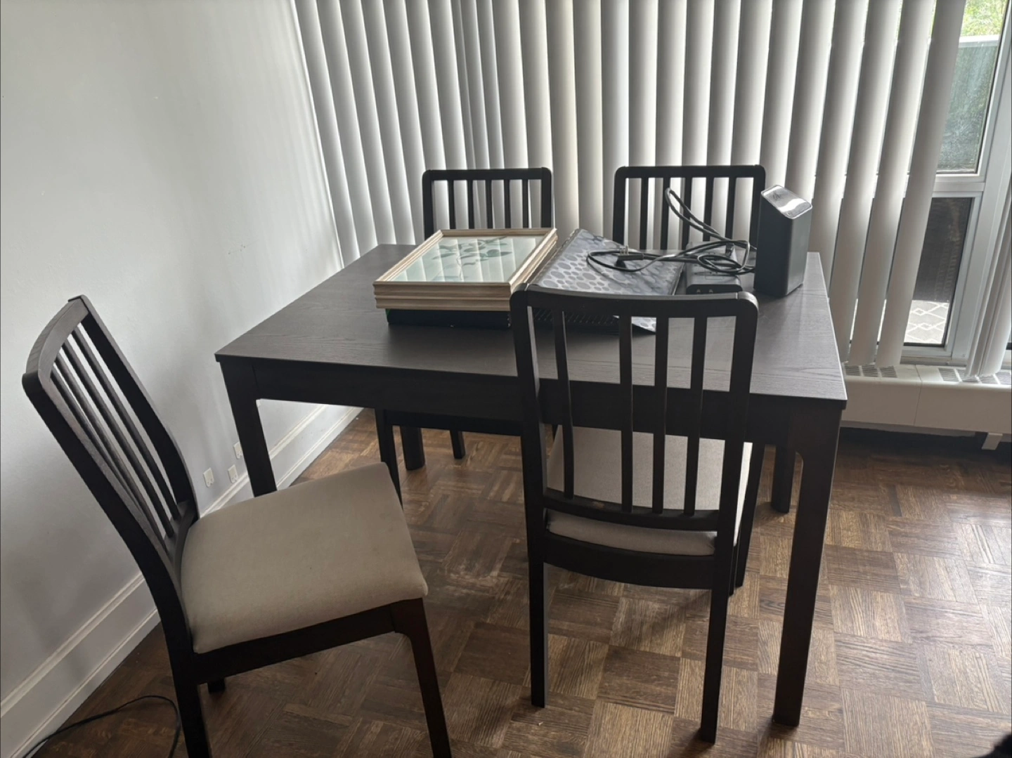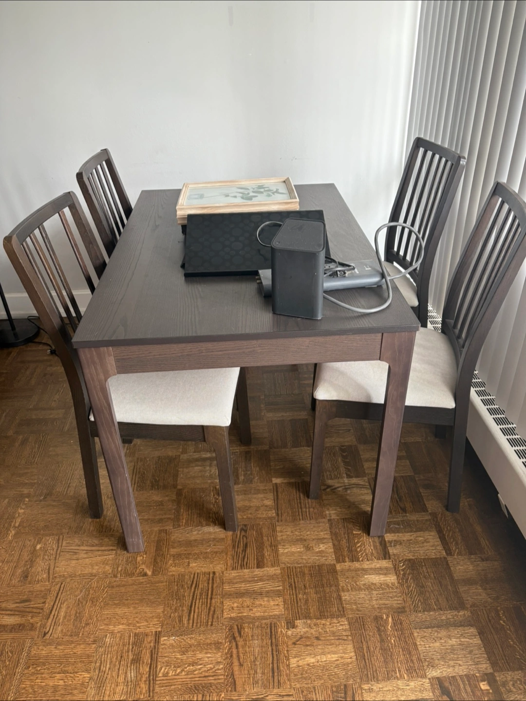 Selling Ikea Ekedalen Extendable table with 4 chairs as I’m moving from my apartment and didn’t really use this table. One chair is missing a rod but still very usable. Sits 4-6 people. Sits 6-8 people with extension.