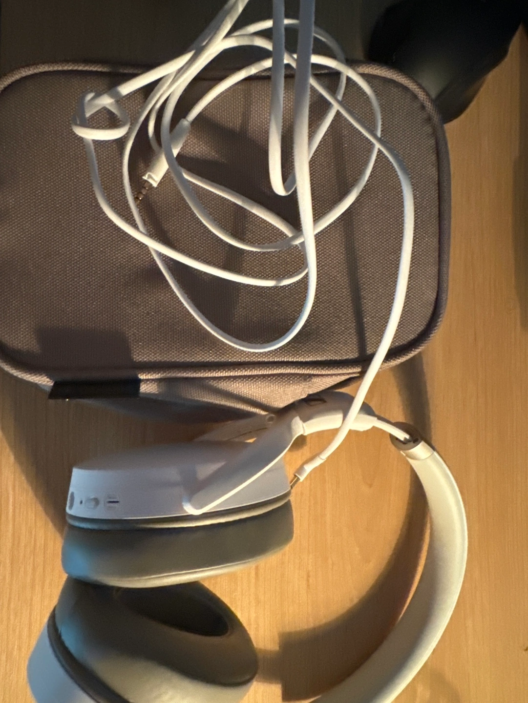 These headphones come with a carrying case. The case has a zipper . The headphones are white and have grey earcups. Has active noice cancellation, a really value for money product Amazing condition barely used