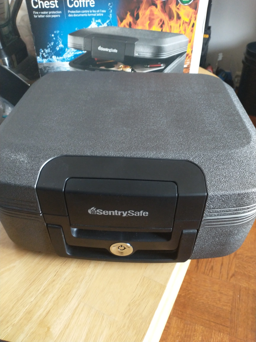 Fire and water resistant chest. Key lock. Includes instruction manual. Excellent for documents and valuables.