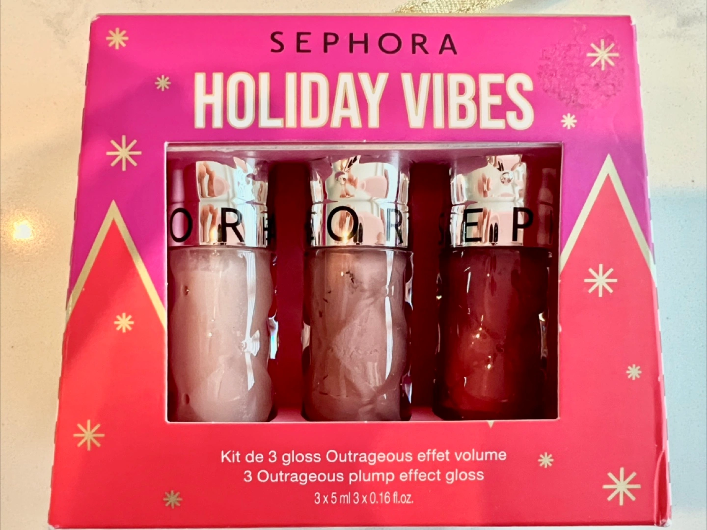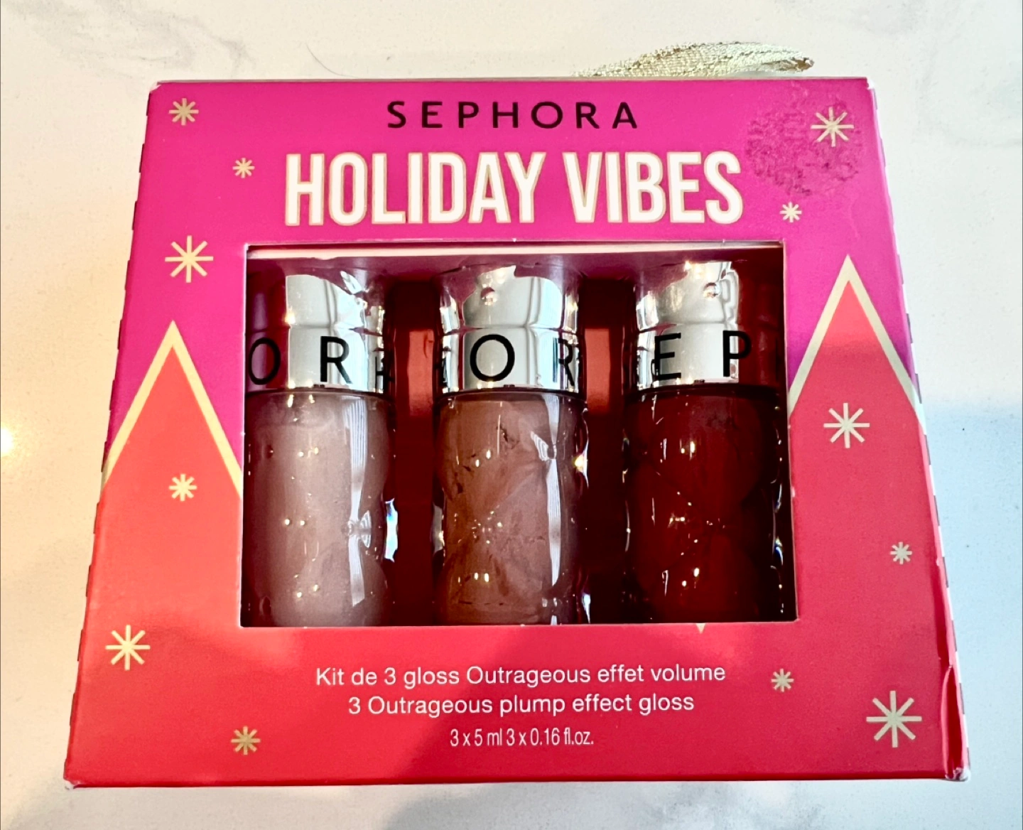New, unopened Sephora Holiday Vibes lip gloss set. Includes three mini lip glosses in various shades. Plumping effect. Perfect for gifting or personal use.