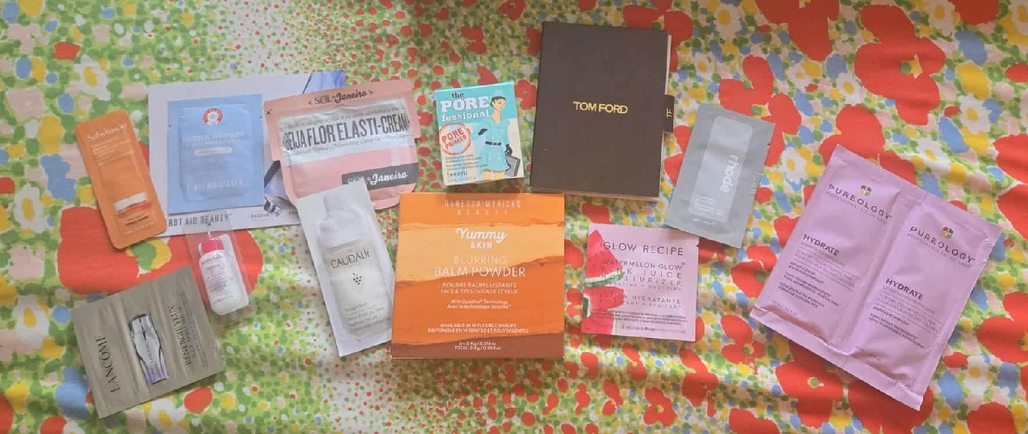 A collection of various beauty samples! Includes brands like Tom Ford, Sulwhasoo, Glow Recipe, and more.