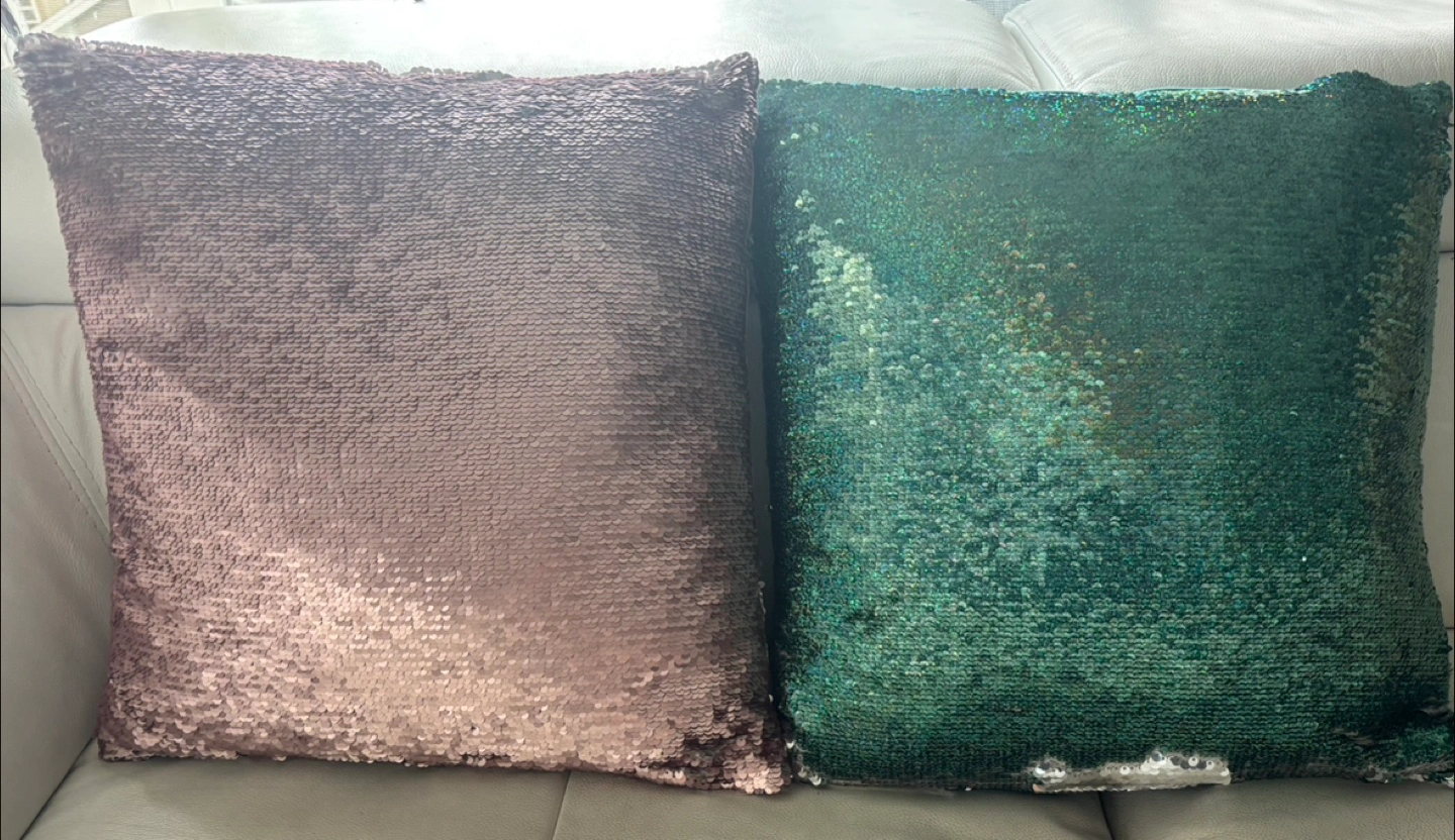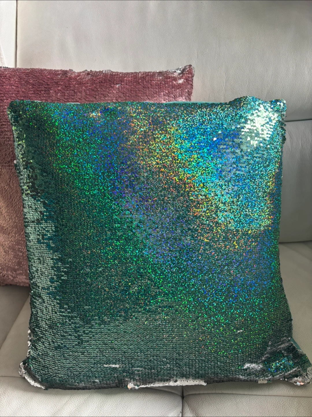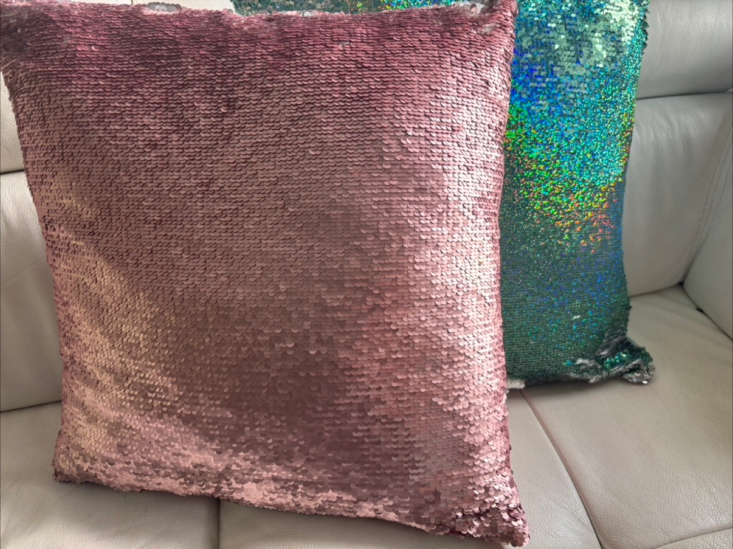 Two decorative throw pillows with a sequin design! One is a lovely rose gold colour, and the other is a shimmering green. They're perfect for adding a touch of sparkle to any room in your home