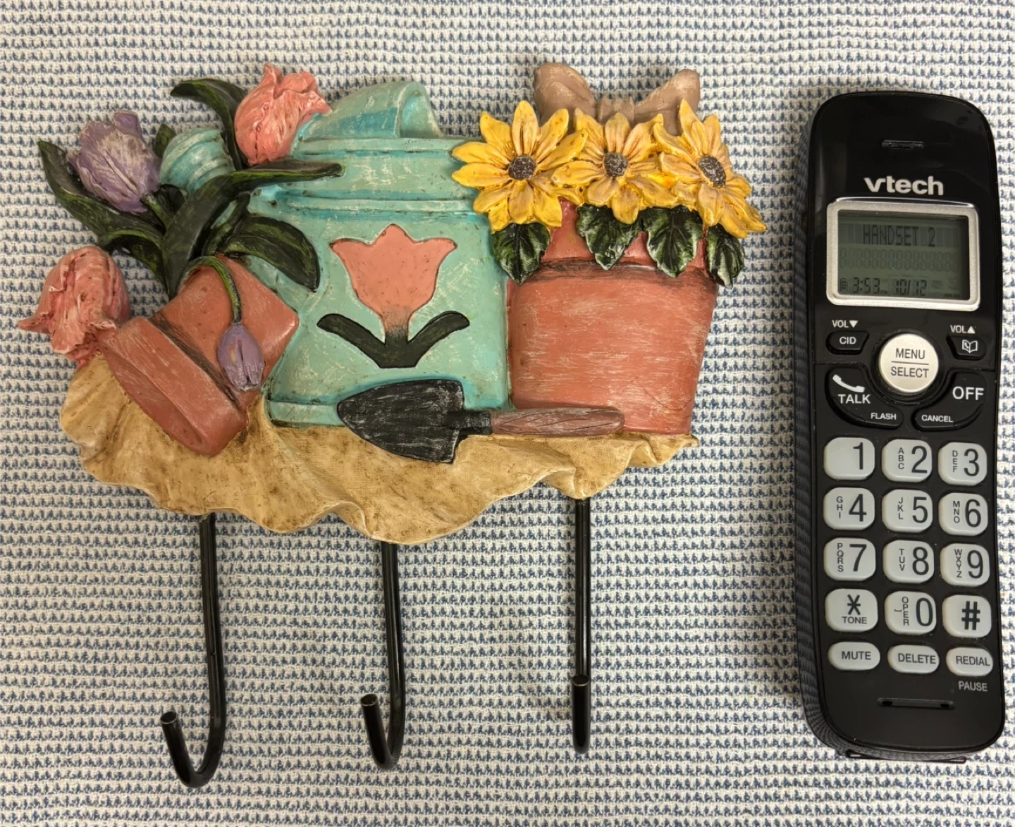 Add a touch of charm to your home with this Serenity Garden hook rack! It features a delightful floral design with watering cans and sunflowers, perfect for hanging keys, towels, or light jackets. A lovely decorative and functional piece! As is, info in photo Could be repainted $5.00 exact cash only