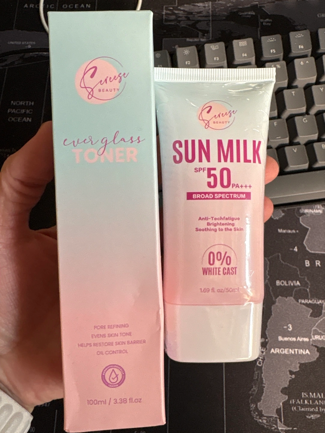 Seresse Beauty skincare . Everglass toner and Sun Milk SPF 50 PA+++. Toner is pore refining, evens skin tone, and helps restore skin barrier. Sun milk is broad spectrum, anti-fatigue brightening, and 0% white cast. Toner $15 Sunscreen $15 take both for $25 Pick up Walden SE
