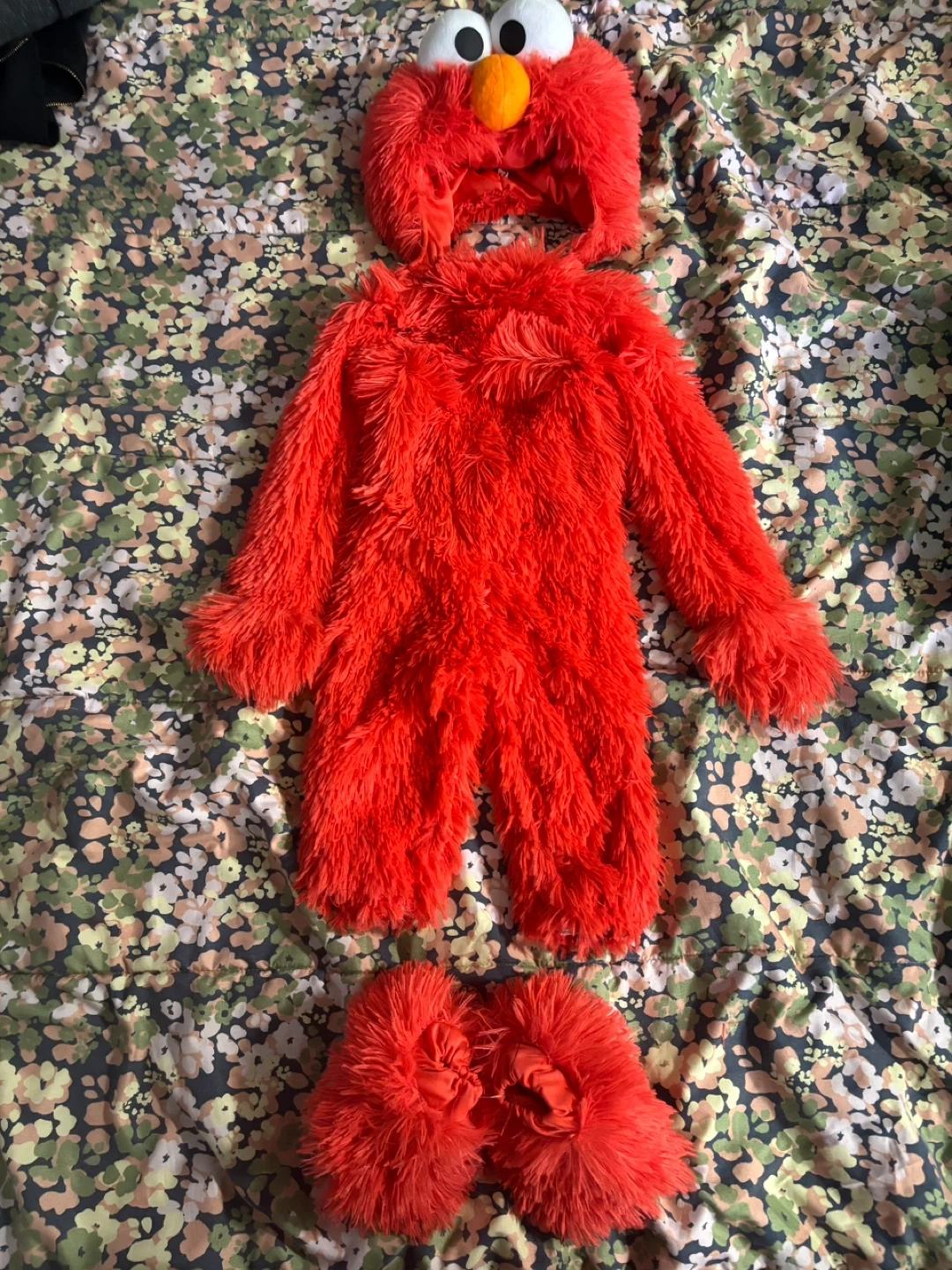 Check out this adorable Elmo costume from Sesame Street! It's a vibrant red and perfect for a little one aged 12-18 months. The costume looks to be in great condition and includes the hooded top and booties. Great for Halloween or dress-up!