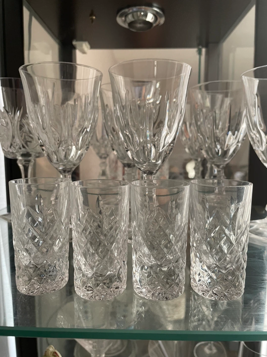 Set of 6crystal glasses. are tall with stems and 4 are shorter without stems. All are clear with a cut design. No chips or cracks.