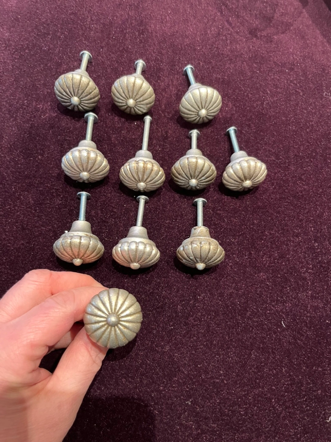 beautiful, antique silver coloured knobs. Perfect for furniture restoration or adding a touch of vintage charm to your home. Each knob features a ridged, dome-shaped design. Screws included. Cash only Bathurst And Steeles Pick up