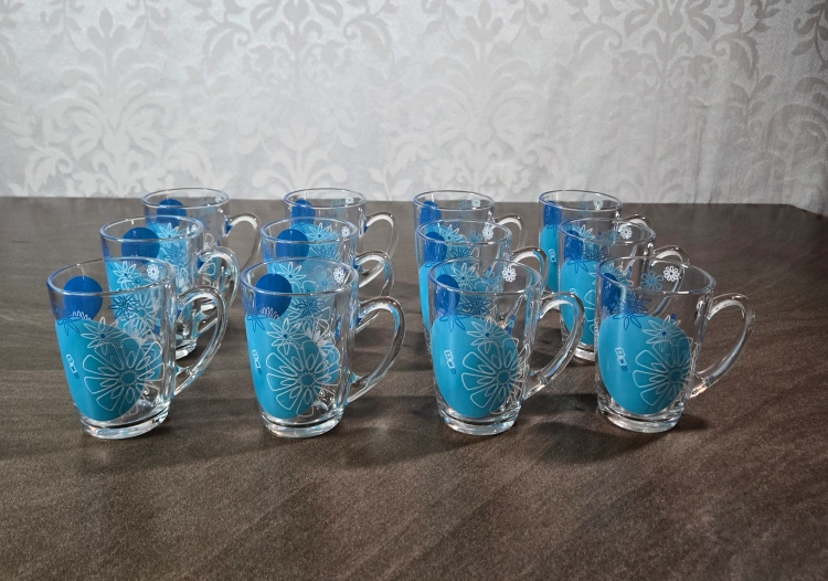 Excellent condition. Set of 12 clear glass mugs, each decorated with a lovely blue and white floral design. Only selling as a set. Cross-posted. 💥If you have a moment please have a look at my other items for sale.