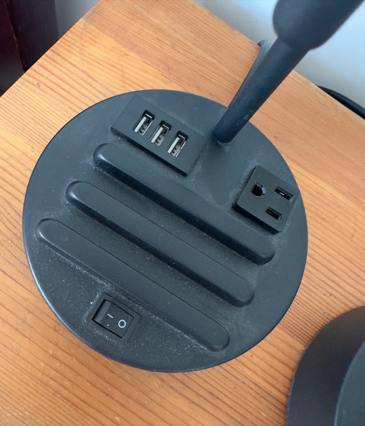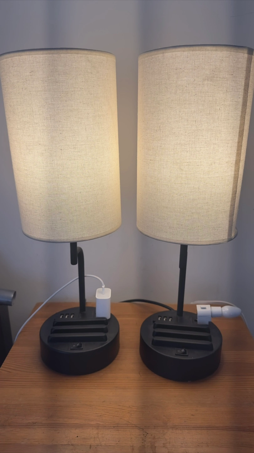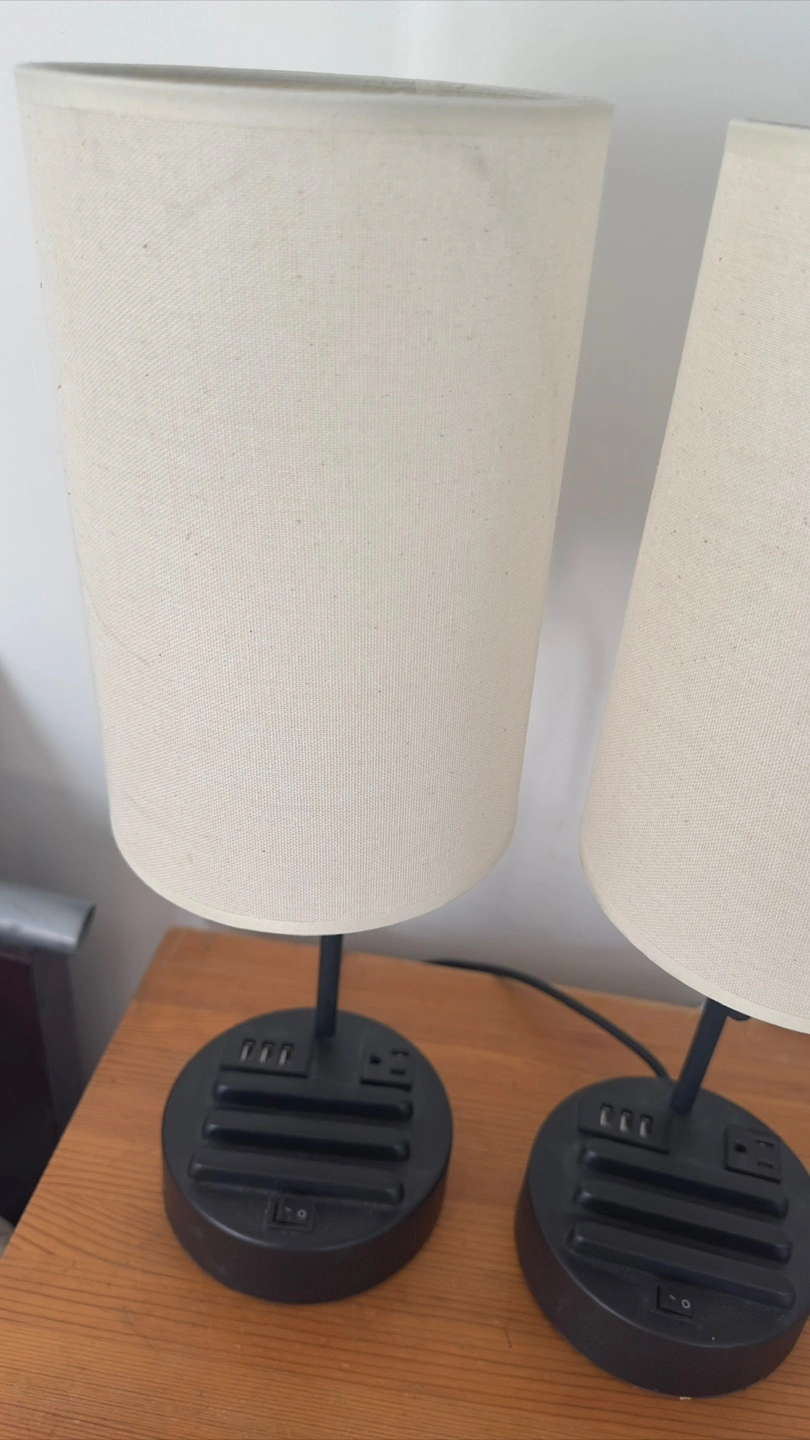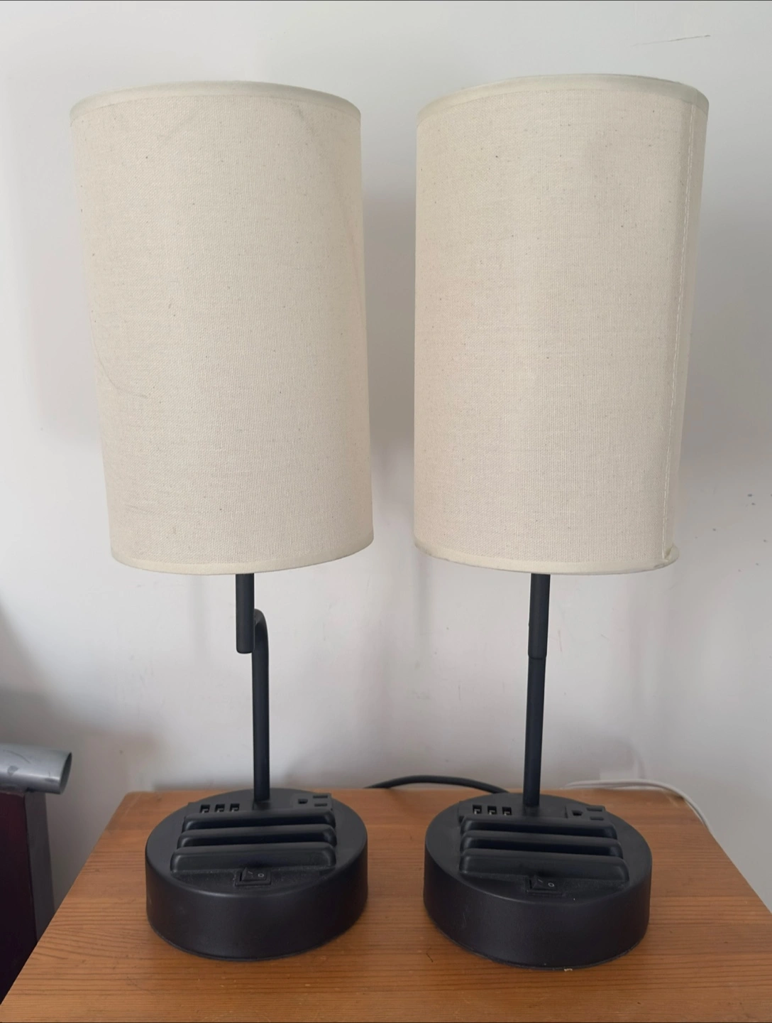 Selling a set of two bedside lamps! They each have a black base and a light beige shade. The base also includes USB ports and an outlet, super convenient for charging your devices right by your bed