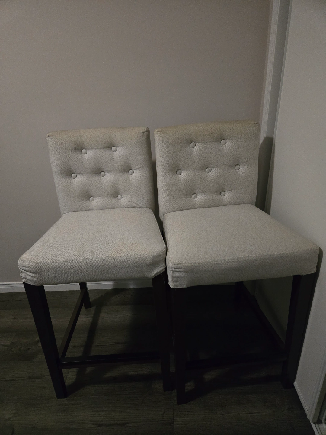 Selling a set of two bar stools. They feature a neutral beige upholstery with button detailing on the back. The legs are a dark colour. They're in good condition and would look great in any kitchen or bar area!