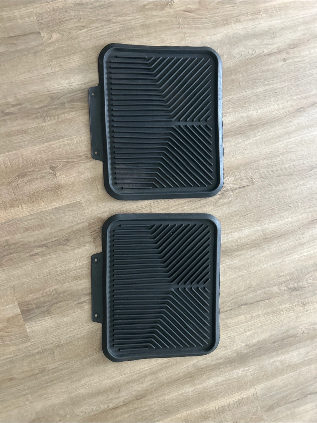 Selling a set of two black rubber car floor mats. They are in good condition and ready to protect your car's interior from dirt and spills
