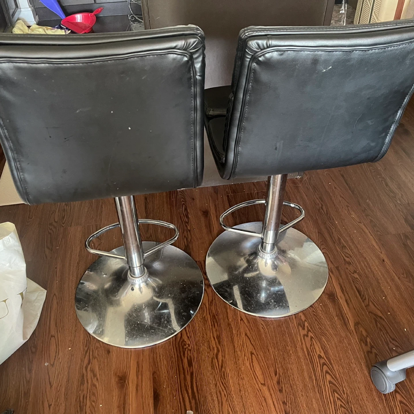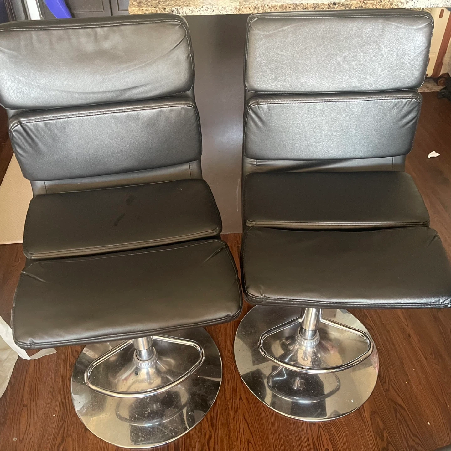 Selling a set of two black swivel bar stools. They're in good condition and would look great in any kitchen or bar area. The seats and backs are padded for comfort, and the chrome bases are sturdy and stylish. Perfect for adding a touch of modern flair to your home!
