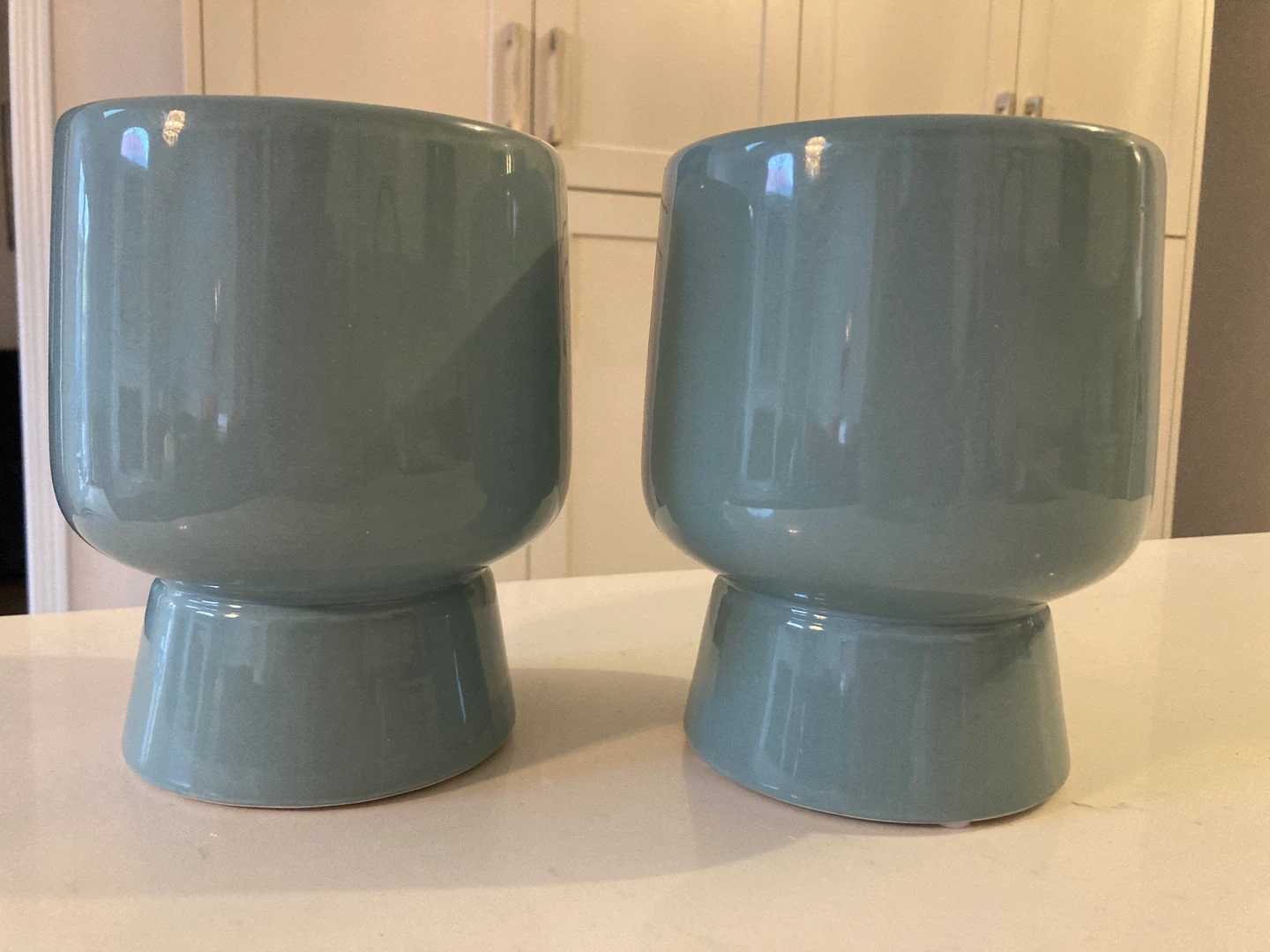 Selling a set of two ceramic plant pots that can be used as home decor as well. They come in a lovely blue-green colour! They're in great condition and would look great with any plant