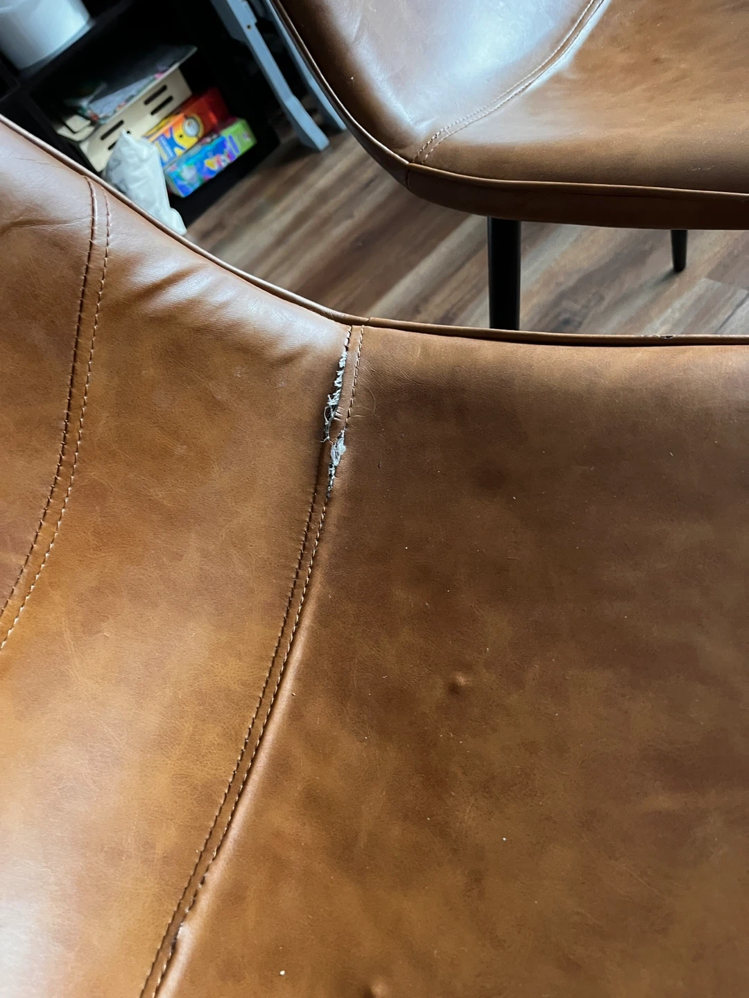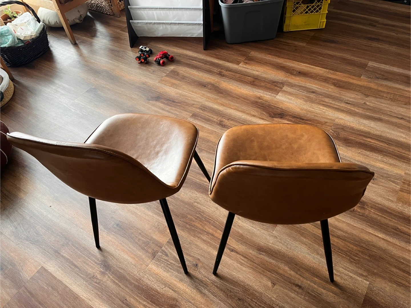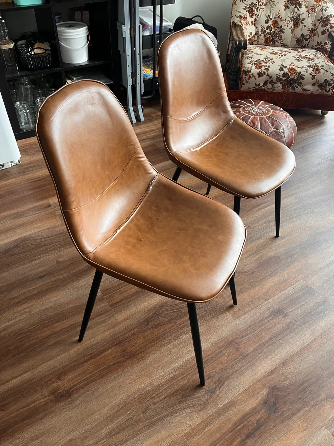 Selling a set of two brown faux leather accent chairs. They're in used condition, with some visible wear on one chair. Perfect for adding a touch of style to your living space or dining area!
