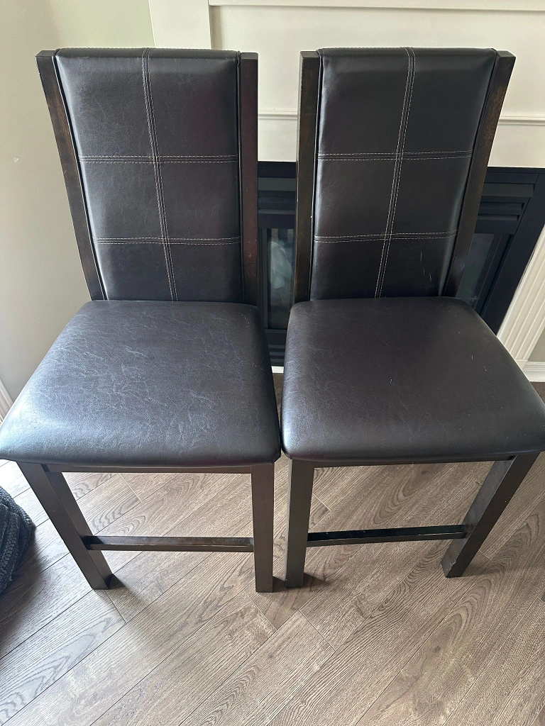 Selling a set of two bar stools. They feature a dark brown faux leather seat and back with a wooden frame. These stools would be a great addition to any kitchen or bar area!