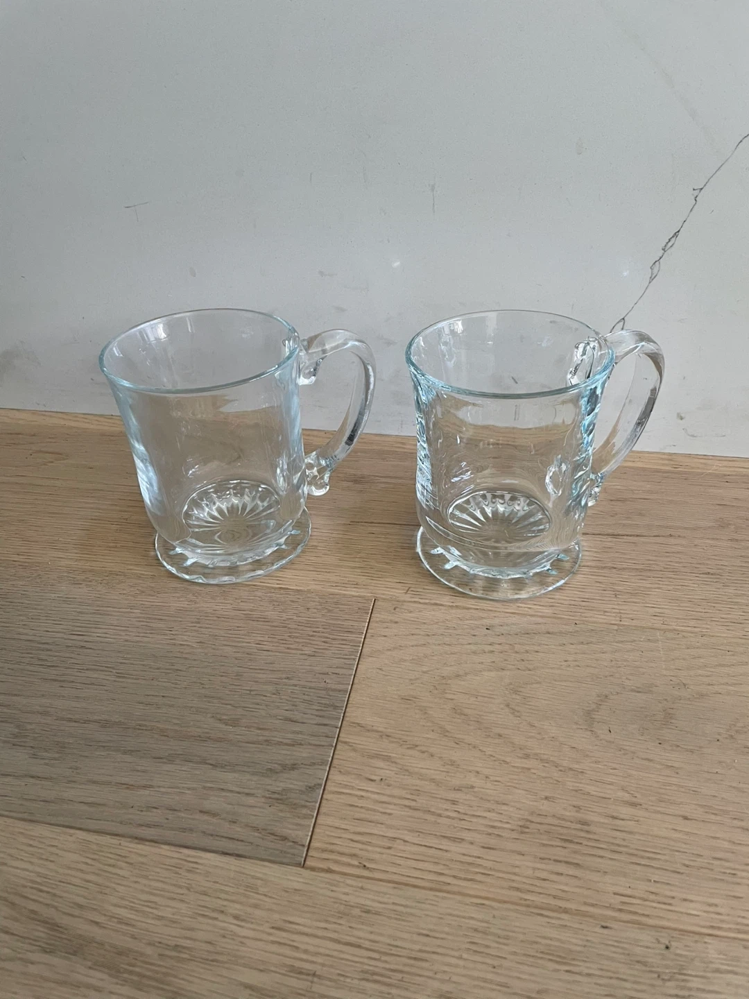 Selling a set of two clear glass mugs. They are in great condition and ready for a new home! Perfect for enjoying your favourite hot beverages on a cozy day Both for 5$ Cash only