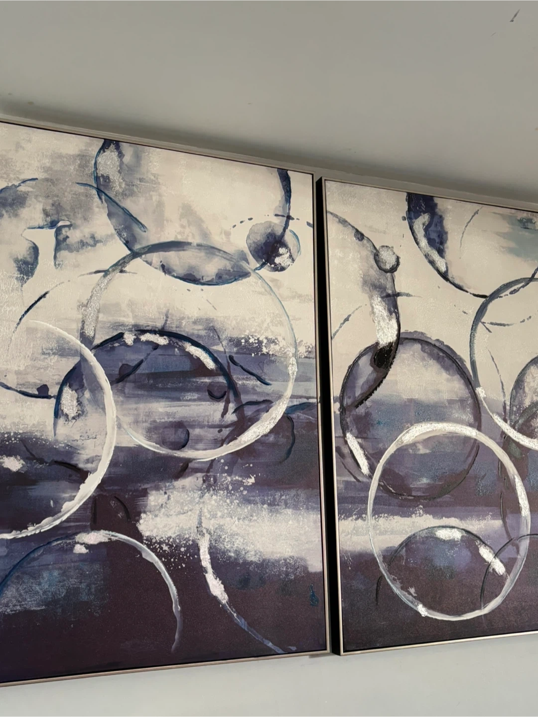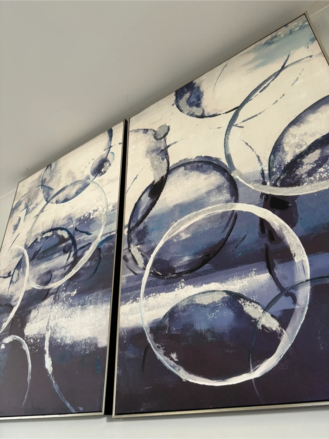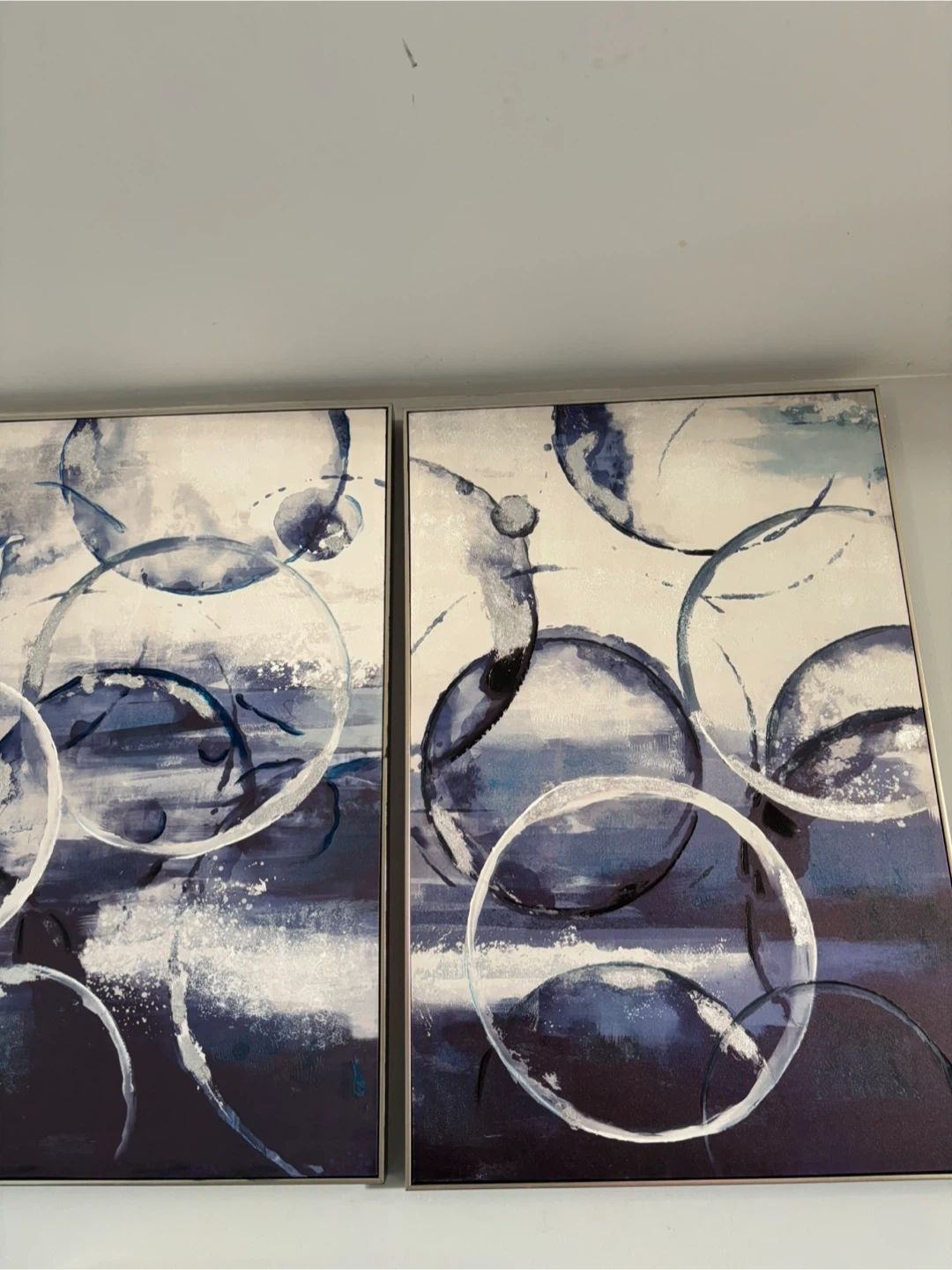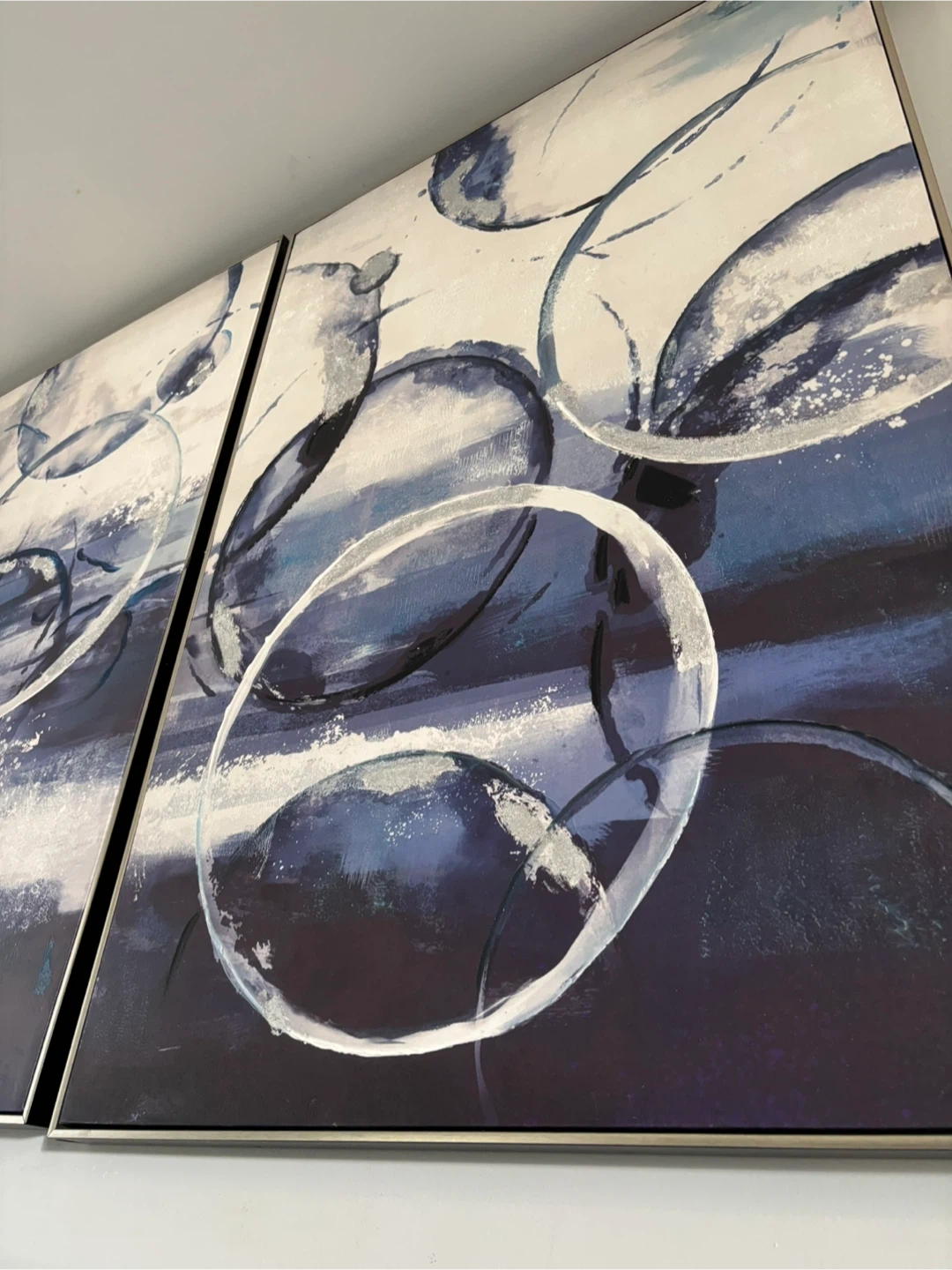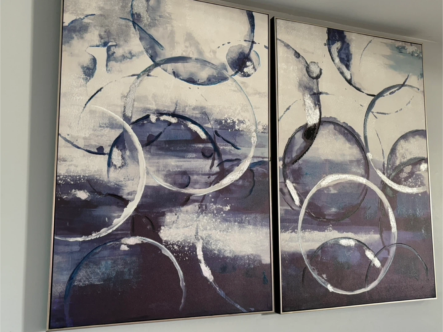 Selling a set of two framed abstract wall art pieces. They feature a modern design with blue, white, and silver tones. These pieces would be a great addition to any living room, bedroom, or office space!