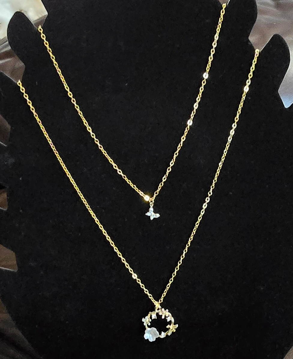 Selling a beautiful set of 2 necklaces! It features a delicate butterfly pendant on the shorter chain and a lovely floral wreath pendant on the longer chain. It's in great condition and would make a wonderful addition to any outfit