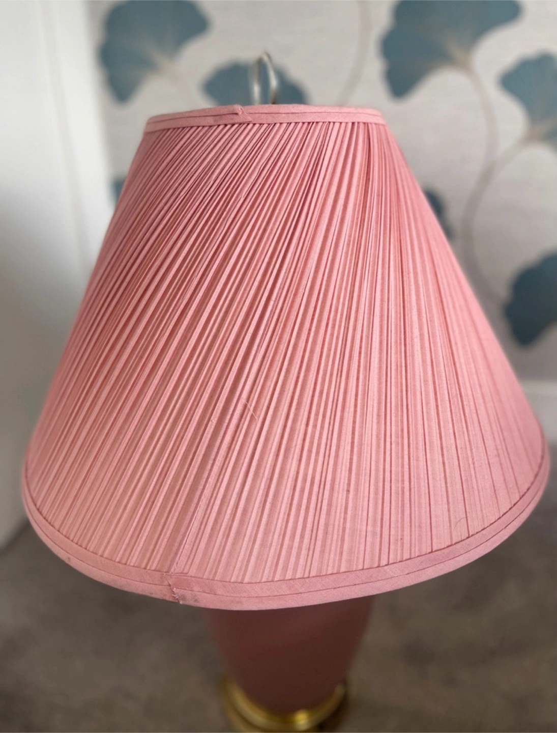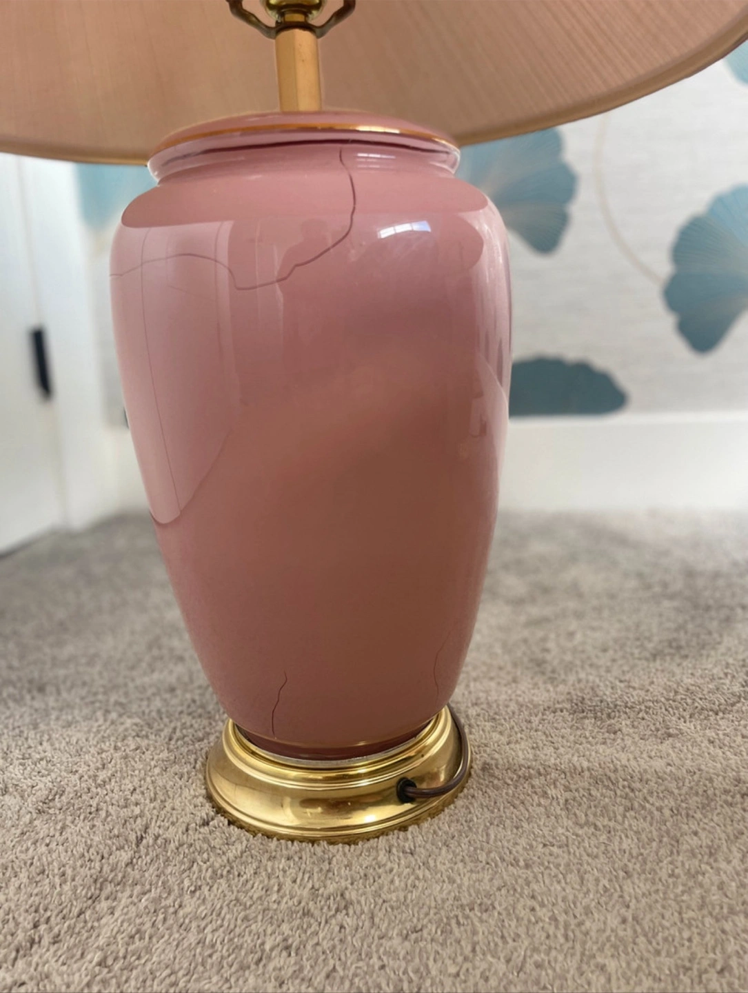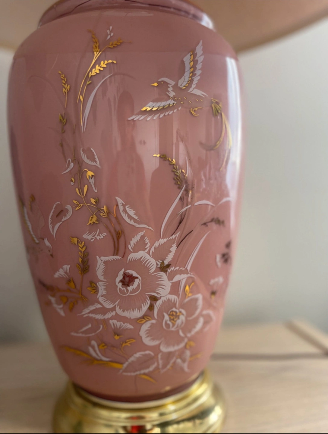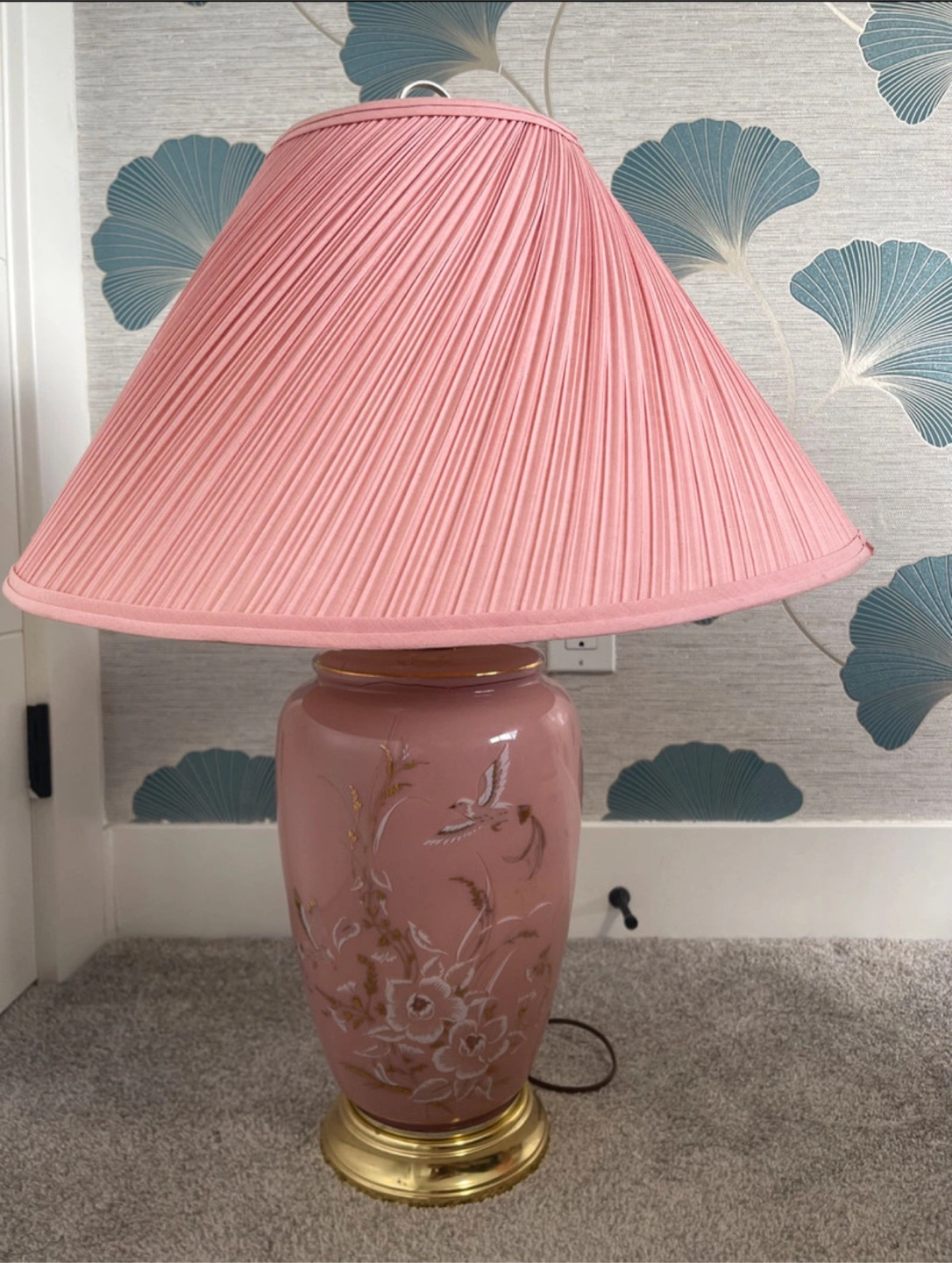 This set includes two pink lamps, perfect for adding a touch of vintage charm to any room. The lamps feature a unique floral design and a soft, ambient glow. They are in excellent condition. !!!THEY ARE NOT CRACKED THE LINES ARE A PAINTED DESIGN!!!!