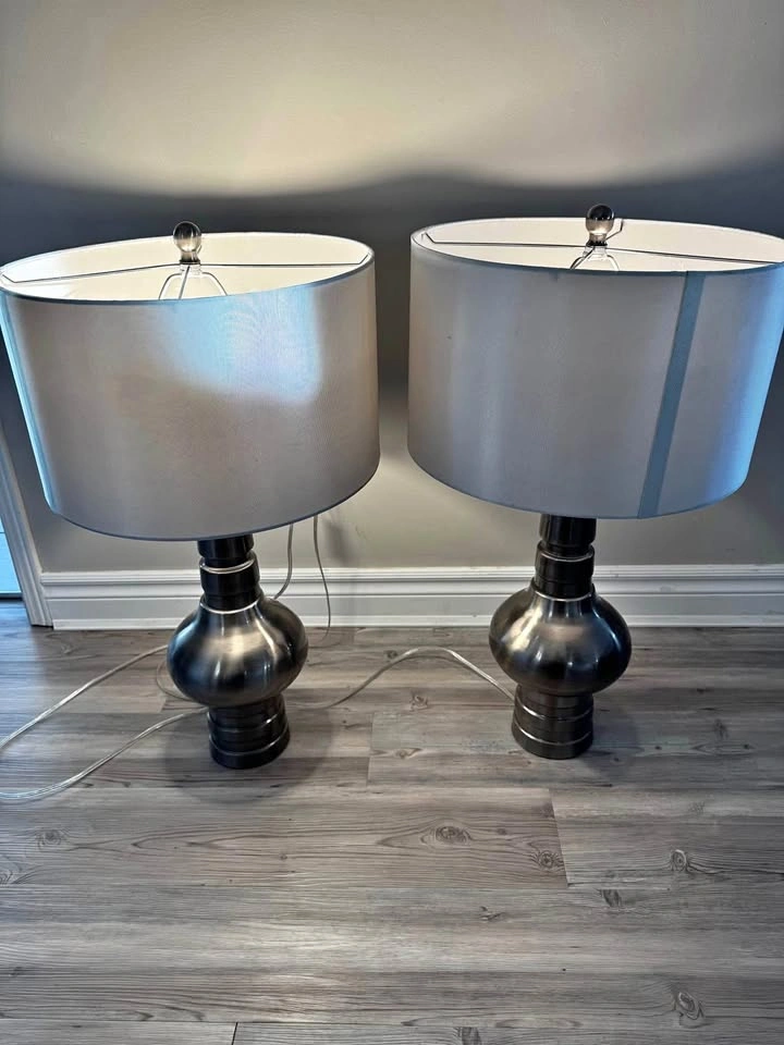 Set of 2 tri-light matching table lamps. Measure 29” high. The shade is 17” diameter for both.