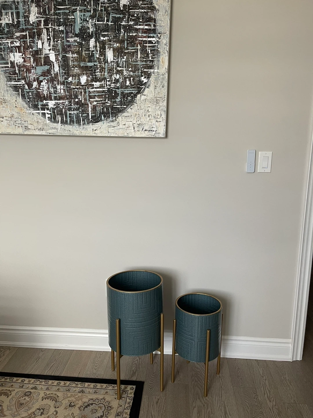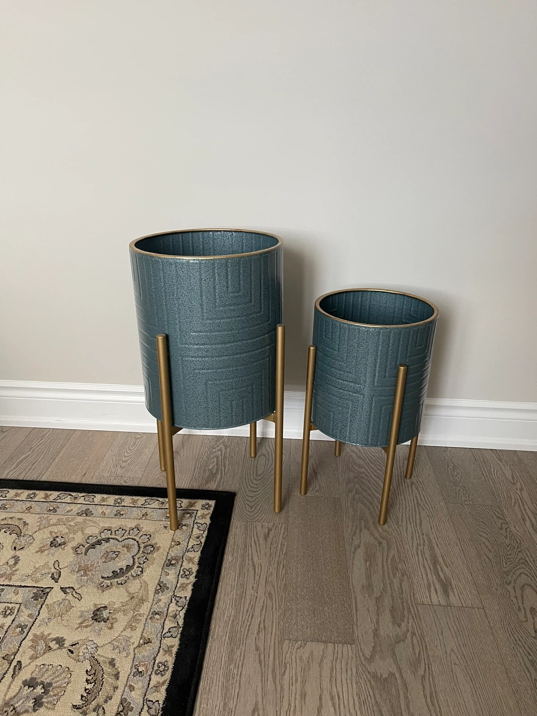 Looking to add a touch of modern elegance to your space? I'm selling a set of two stylish plant stands. They feature a beautiful teal textured finish with sleek gold legs. Perfect for showcasing your favourite plants and adding a pop of colour to any room!