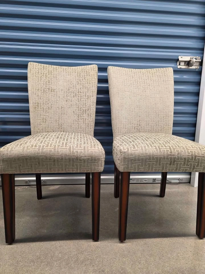 Pair of stylish dining chairs with a modern gray patterned fabric and sturdy espresso-finish wooden legs. Comfortable padded seat and backrest, perfect for dining rooms, kitchens, or extra seating. Dimensions: 38" H x 19" W x 26.25" D. Excellent condition and built to last. Comparable sets retail for over $500 – grab this pair at a great price.