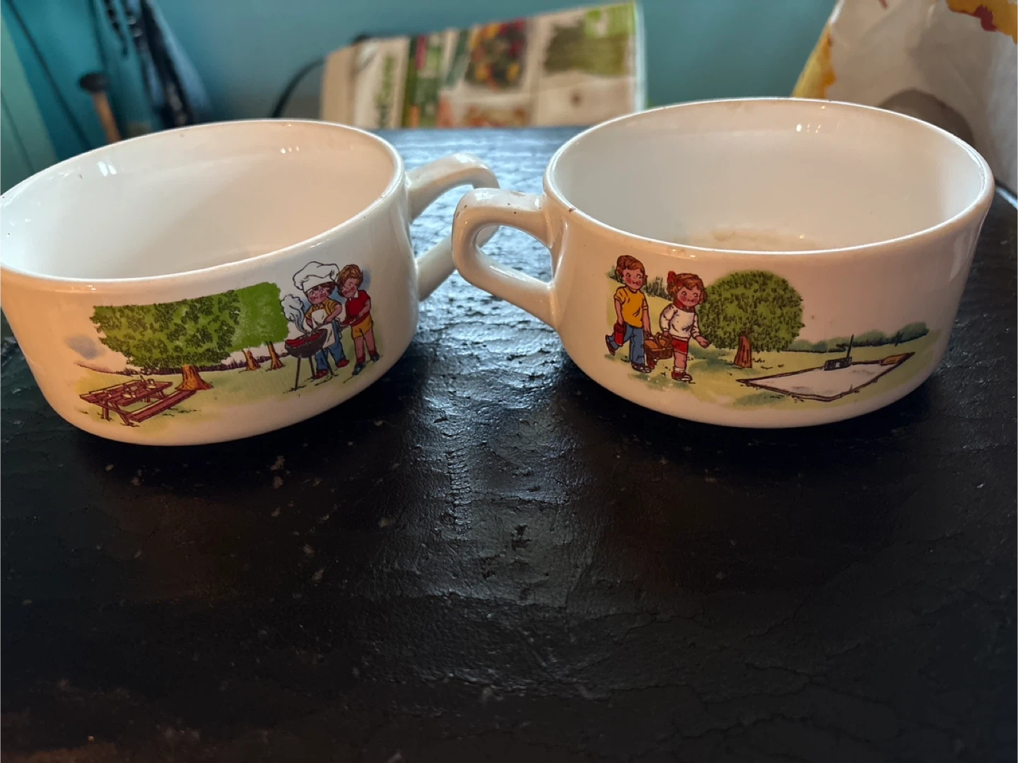 Selling a set of two vintage soup bowls! They have a cute cartoon design around the outside. Perfect for soup or cereal!