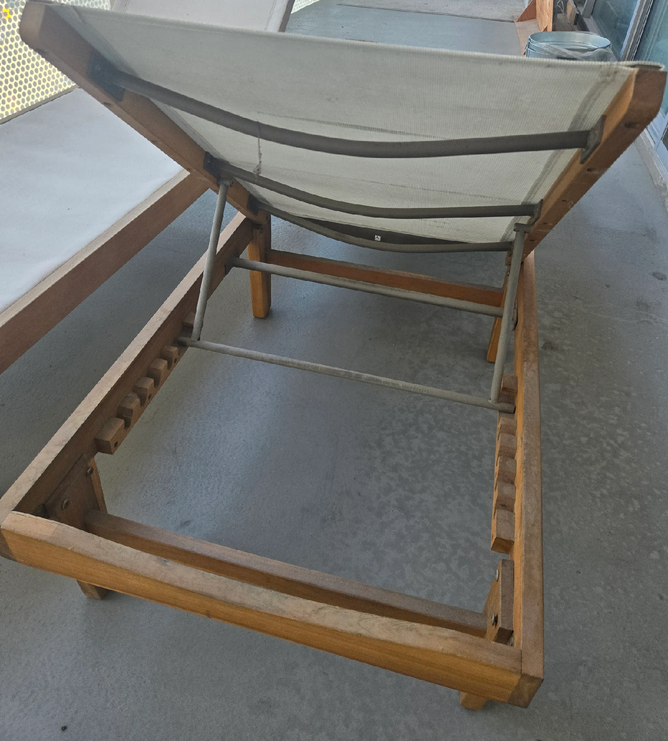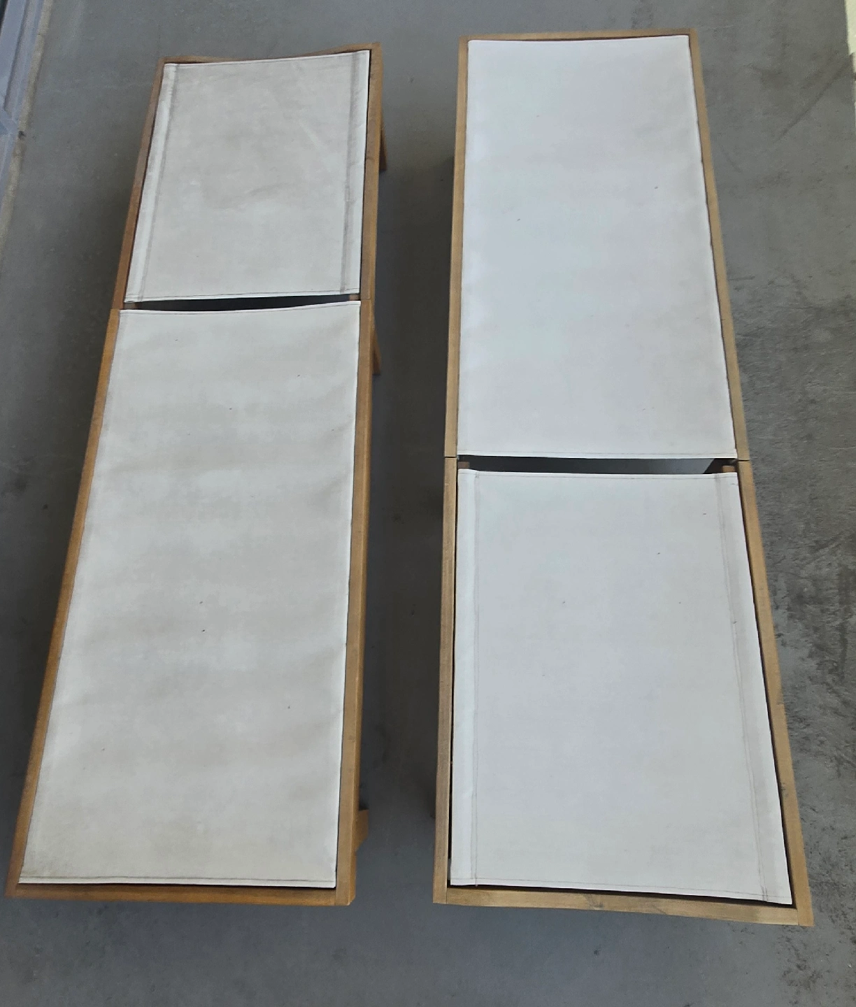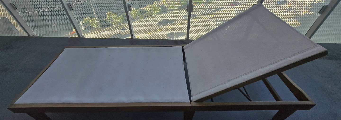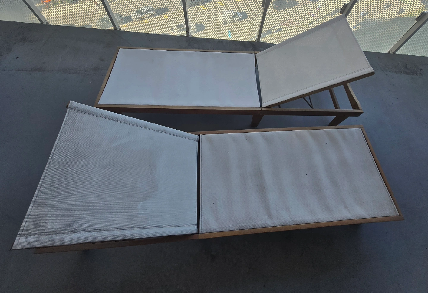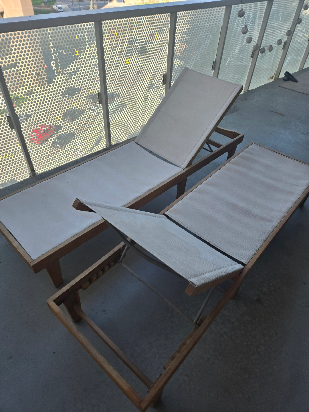Selling a set of two outdoor loungers. They feature a wooden frame and a light-colored fabric surface. Perfect for relaxing on the patio or by the pool or for your balcony!