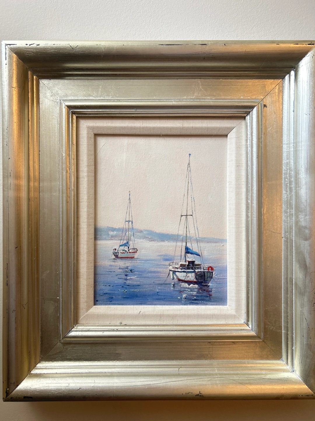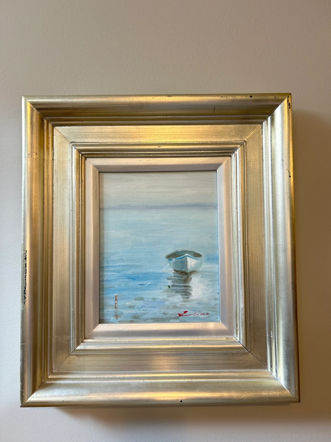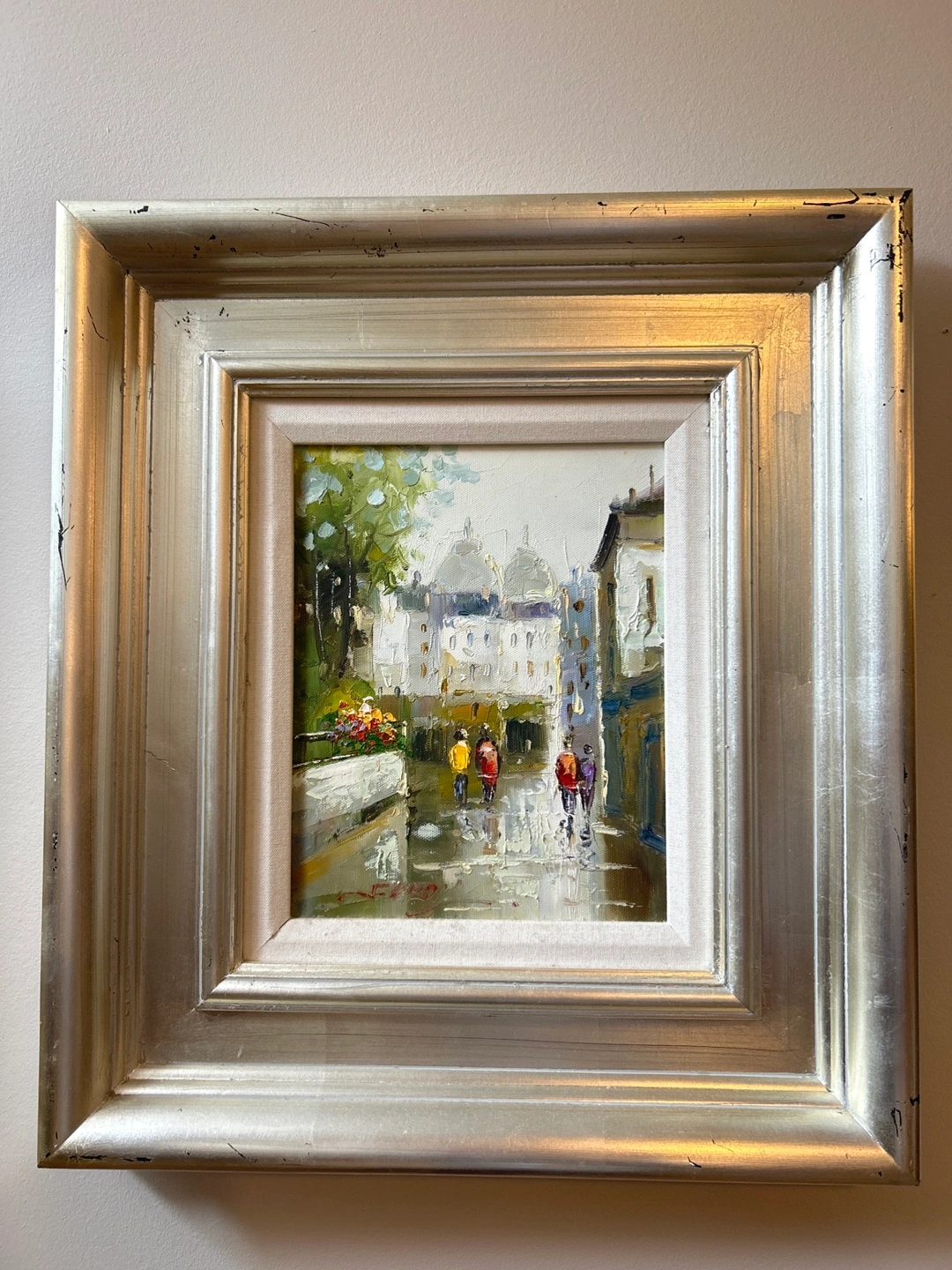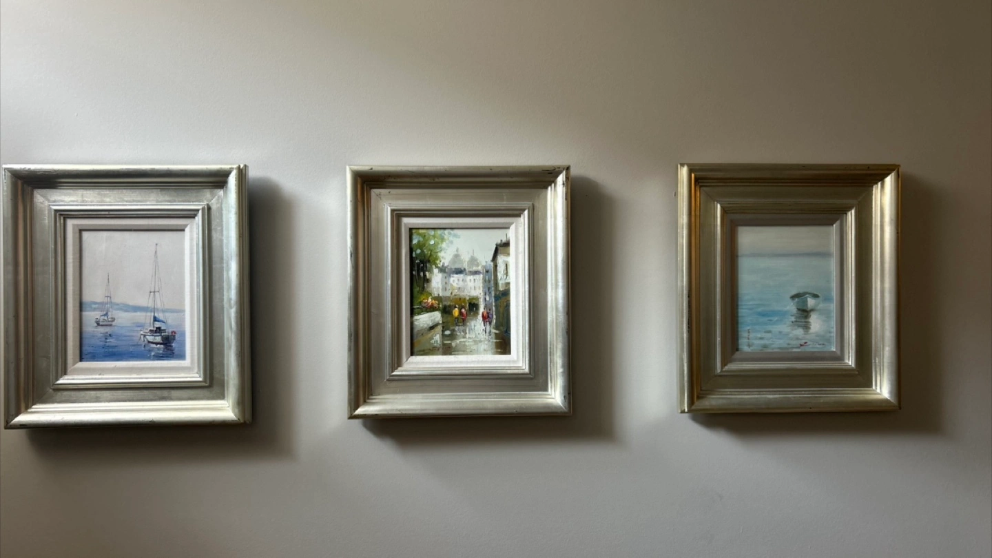 3 Oil Paintings. Framed in silver/gold in some light, authentication attached on the back and signed by the artist - each features a different scene 1. Morning Harbor - J Norton 2. "WET DAY, BELFAST CITY CENTRE" by Irish artist Holly Hanson- Hanson is known for her impressionistic style and frequently paints scenes of Belfast and Dublin, often on wet days. Her work has been sold at auction for prices ranging from $412 to $826 USD. The painting in the image is a typical example of her work, showcasing her ability to capture the atmosphere of a rainy day in an urban setting 3. An original oil painting on canvas by Danish artist Kalle Hintze Mathiasen (1917-2004). The painting depicts a boat at the beach near Skagen, Denmark. It is framed and signed by the artist. The painting is from the late 20th century.