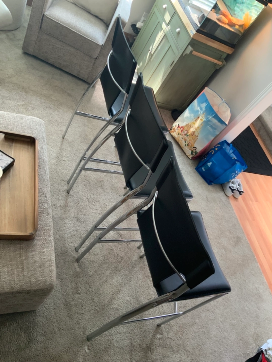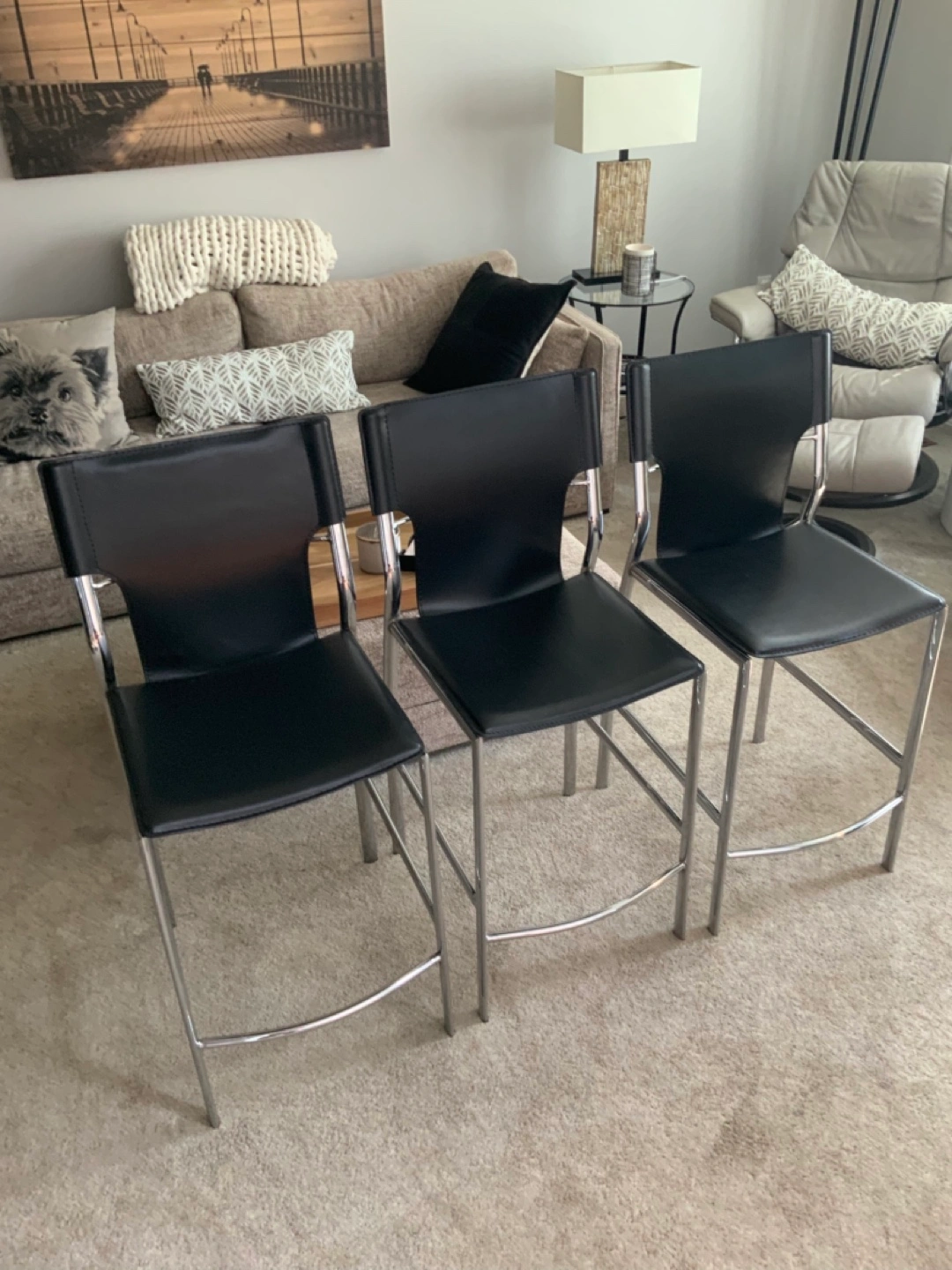 Selling a set of three leather bar stools with black seats and silver frames. They're in great condition and would look fantastic in any kitchen or bar area! Perfect for adding a modern touch to your space