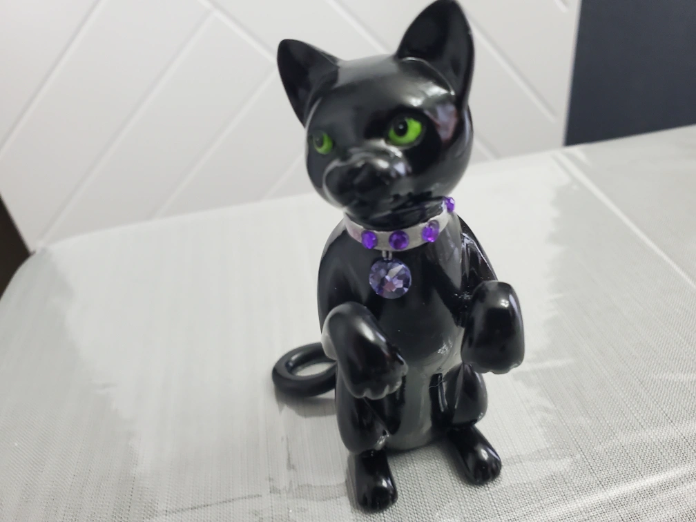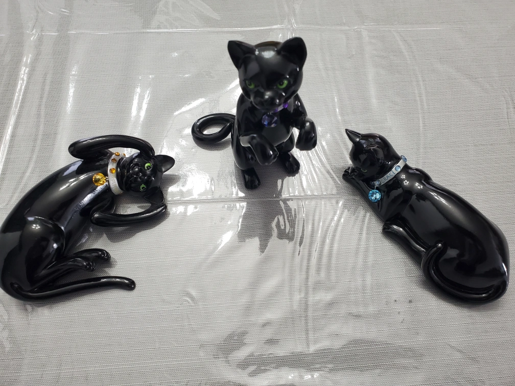 Set of 3 black cat porcelin figurines from the Black Cat Collection. Each cat has green eyes and a jeweled collar. One cat is standing on its hind legs, one is lying down, and the other is curled up. All 3 cats are in beautiful condition.