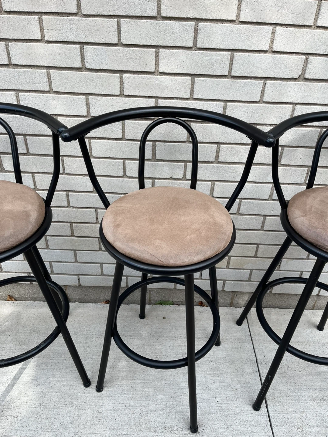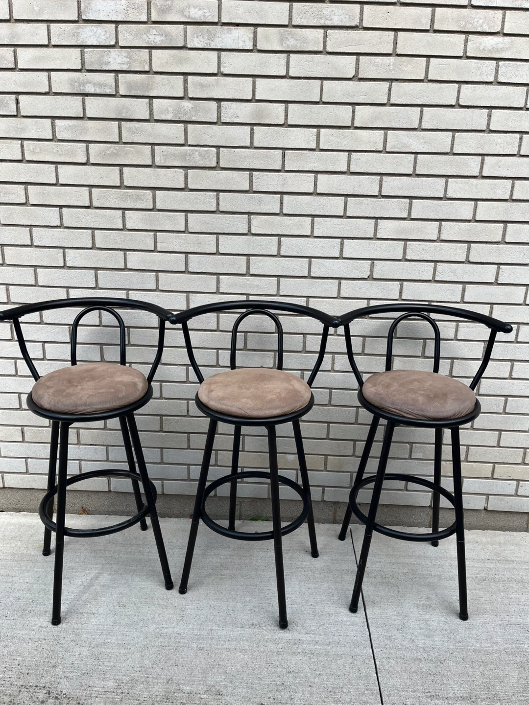 Selling a set of three bar stools. They feature a black metal frame and a round, cushioned seat in a neutral colour. These stools would be perfect for a kitchen island or home bar area. They're in great condition and ready for a new home