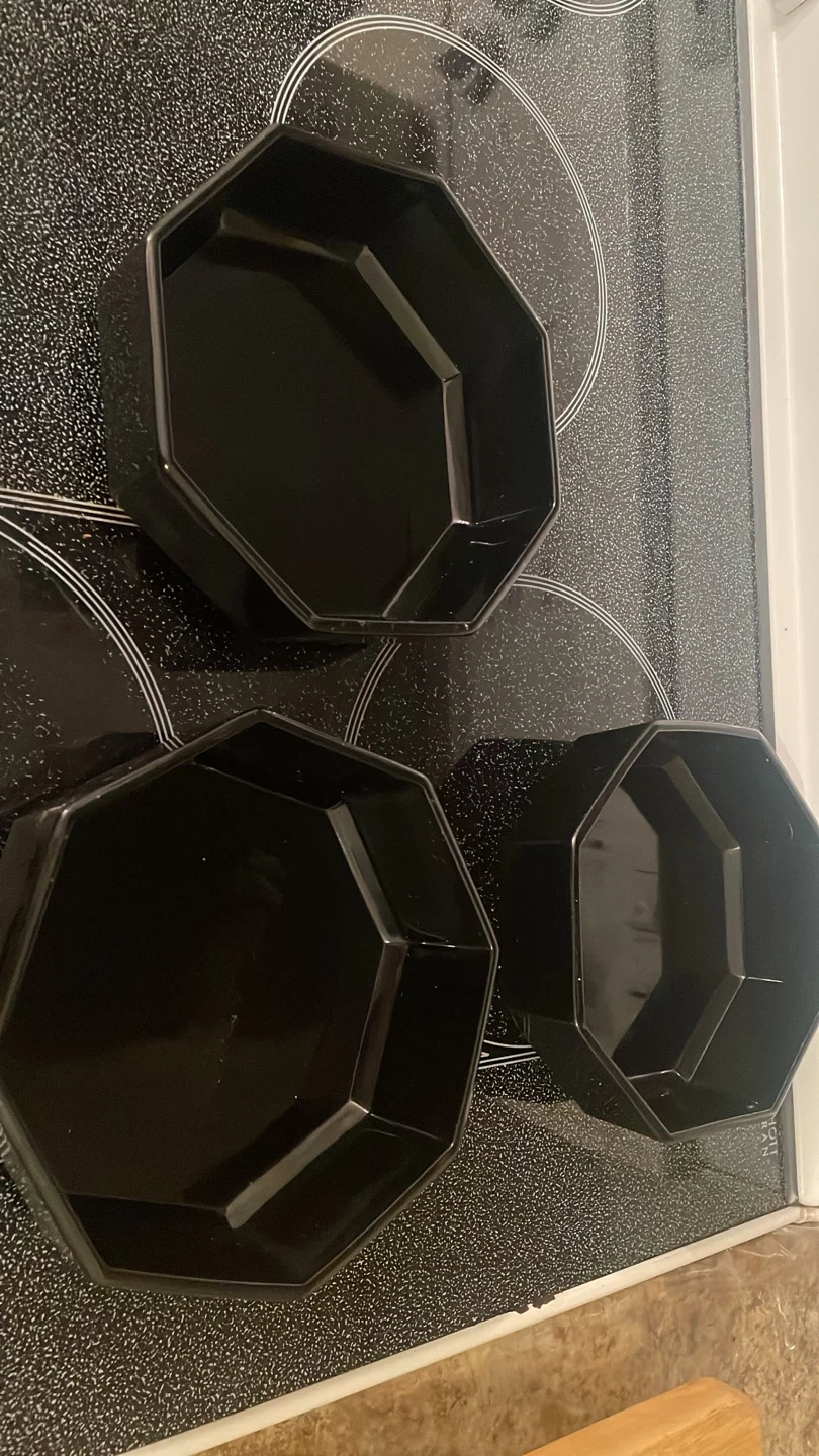Selling a set of three black octagon-shaped bowls. They appear to be in good condition and would be great for serving snacks or small dishes. Perfect for adding a modern touch to your kitchen or dining table!